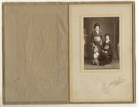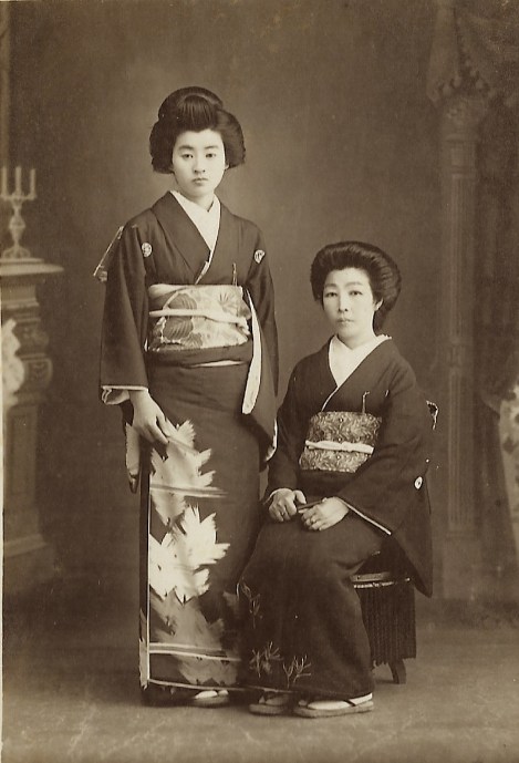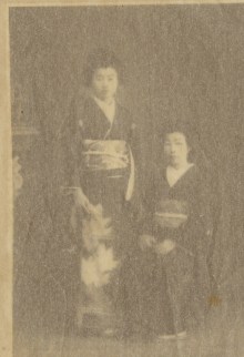 This vintage photograph features two Japanese women wearing traditional kimonos. The pair look more like sisters than a mother and daughter. The photograph was taken by a photographer with the last name of Maki. He operated a photo studio in Iwaki, Japan. The city of Iwaki is located in Fukushima Prefecture. In terms of area, Iwaki is the tenth to largest city in Japan. This photograph measures about 4″ x 6″ and is in very good condition (see scans).
