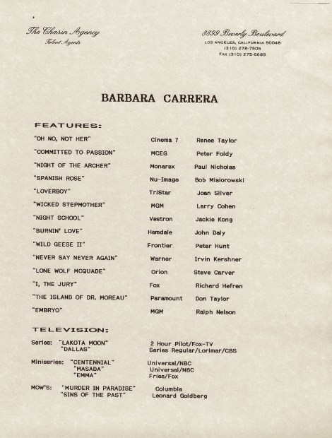 This photograph features film and television actress Barbara Carrera (1945- ). She was born in Nicaragua and was a television and film actress, as well as a model. Her mother was Nicaraguan and her father was an American employee of the American embassy in Nicaragua. Her parents separated, and at around the age of ten years old, she moved to Memphis, Tennessee to be with her father. At age fifteen, she moved to New York. At seventeen, she began a career as a model at the Eileen Ford agency. Her first film role was in 1970 and in 1976, she earned her first Golden Globe nomination. A second nomination followed in 1984. Among her appearances were “Never Say Never Again (1983)”, “Condor Man” (1981), and on the television series “Dallas”(1985). Carrera graced the pages and covers of many magazines including Vogue, Paris Match, and Harper’s Bazaar. She twice posed for Playboy (1977 & 1982). She ended her television/film career in 2004. The IMDb reports that the actress had 39 film and television credits. Carrera had three marriages, all ending in divorce. This image, accompanied by Miss Carrera’s resume, was sent to a casting director, or some other film decision maker, to ask for consideration for an acting role in the production. The logo of the Sterling/Winters Company can be seen on lower border of this photo. Sterling/Winters is a celebrity talent agency for numerous actors, musicians, athletes, and others. The heading on the resume indicates that it was prepared by “The Chasin Agency” of Los Angeles, California. This organization functions in the Talent Agent, Theatrical Business, and Amusement and Recreation Services sector. This photograph was formerly part of the Harvey and Rhoda Kuflik collection.The Kuflik collection has been touted as “the greatest celebrity autograph collection on the planet”. From the 1980’s until his death in 2002, Harvey had access to film industry agency headshots and resumes that were used in the casting process. This photograph and resume of Barbara Carrera is an example of these casting materials. Harvey and Rhoda Kuflik were siblings. The pair grew up in New York City and they amassed a very large collection of celebrity photos and autographs. In adulthood, Harvey moved to Los Angeles while Rhoda stayed in New York. They would reunite in Hollywood each year to add to their collection during Oscar week. When the pair passed away, Harvey (1942- 2002) and Rhoda (1938- 2012); the siblings left the collection to Harvey’s son, David. It bothered David that the collection was not available for the public and interested collectors to see and enjoy. He decided to put the individual items in the collection up for auction. This 8×10 photograph is in excellent condition. The content of Miss Carrera’s resume indicates that the photo and the resume were mailed in about 1994.