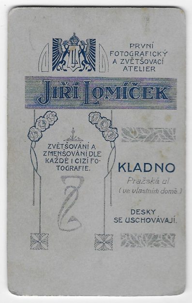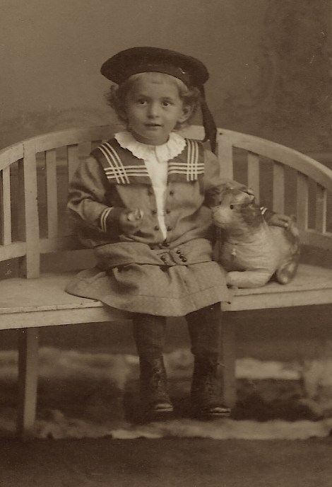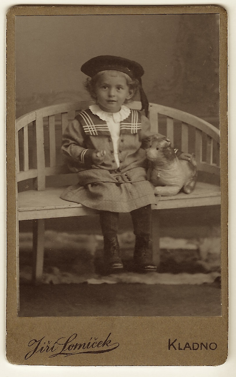 This carte de visite portrait features an adorable child sitting on a wooden bench next to a toy dog. The child is wearing a cute sailor style outfit. The photograph was taken by the Jiri Lomicek studio in Kladno, Czechoslovakia. Kladno is a city in the Central Bohemian region of the current Czech Republic. It is located 16 miles northwest of Prague. This cdv is in very good condition (see scans).