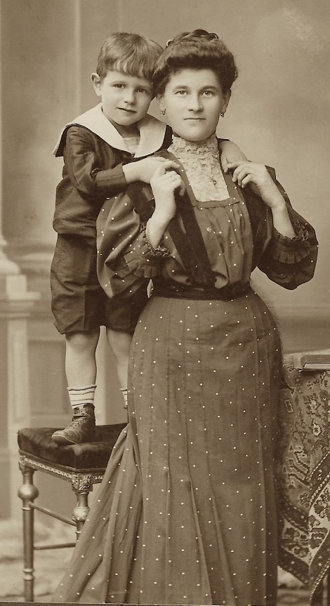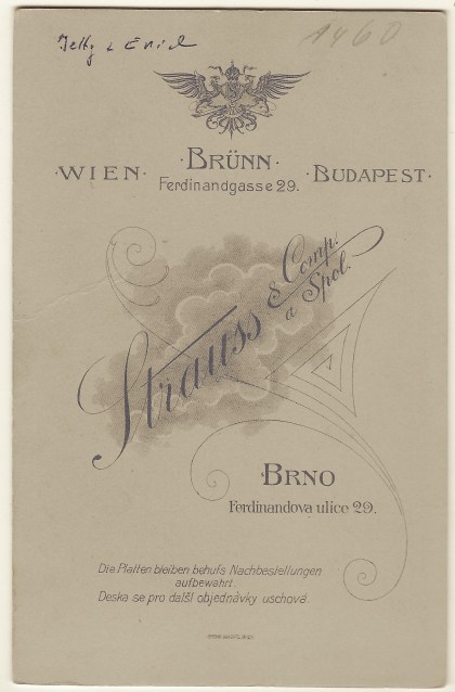 This image is an exceptionally beautiful cabinet card portrait of a pretty mother and her adorable young son. Mom is very well dressed and wearing a necklace, ring, and earrings. She appears confident as she stares at the camera. Her son, standing on a chair, has his arms draped around his mother’s shoulders. He is wearing a nautical type outfit. There is a book on a table in the background. An inscription on the reverse of the photograph indicates that mom’s name is “Jetty” and her son’s name is “Erich”, or possibly, “Emil”. The inscription is difficult to decipher, so the names I provided are just my best guess. The cabinet card photo was taken at the Strauss studio. Strauss had studios in Vienna (Austria), Brunn (Czechoslovakia), and Budapest (Hungary). It is likely that this photo comes from the studio in Brunn. SOLD