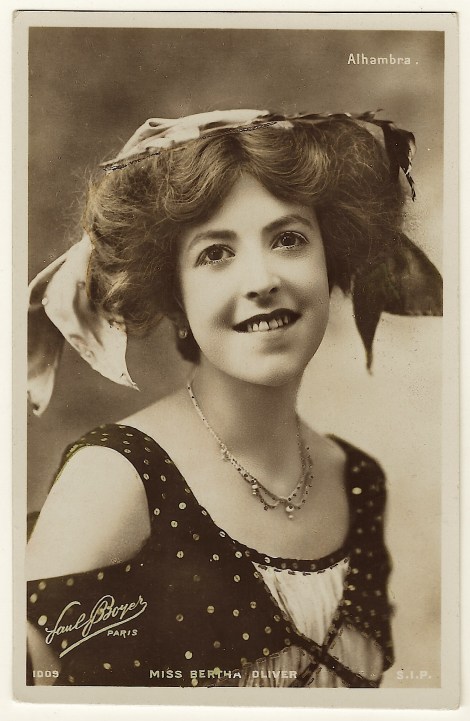 This vintage real photo postcard features stage performer, Miss Bertha Oliver. She is beautiful and has a wonderful smile. This photograph was issued for Alhambra, a popular music hall in Paris, France. This postcard portrait was expertly taken by the celebrated French photographer, Paul Boyer (1861-1908). He photographed many famous people during his career. This postcard is published by Societe Industrielle de Photograpie (SIP) of Rueil, France and was part of a series (no. 1009). The postcard has excellent clarity and is in very good condition (see scans). (SOLD)