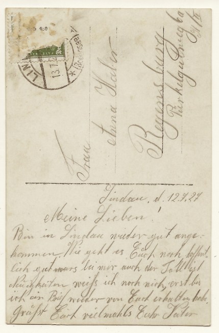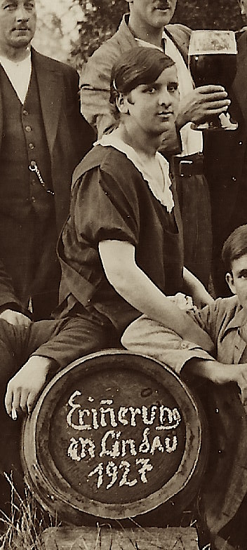 This vintage real photo postcard features a group of German beer lovers gathered around a keg in a country-side setting. This photograph is a treasure trove of interesting elements. First, the keg of beer is labelled with the title “Memories in Lindau 1927” (translated from German). Second,the bruiser in the center of the back row is holding a beer mug on steroids. It is likely that no one will challenge or fight him for the huge glass of dark beer. Finally, what is the story about the gentleman/lady in the center of the middle row. To quote the Kinks, “Girls will be boys, and boys will be girls”. It is likely that the man wearing the dress, seen in this postcard, did so for fun. It is not unusual to see cross dressing in photographs from this era. Generally, wearing opposite sex clothing in these images was done for entertainment, rather than for sexuality reasons. Women also dressed as men in photographs. Vesta Tilley (1864-1952) was an English music hall performer who was one of the most famous male impersonators of her time. She was a star in both Britain and the United States for over three decades (see her photo below). Returning to the subject of the beer drinking celebrants, we learn from the writing on the keg, that they are partying in Lindau, Germany. Lindau is a major town and an island in Bavaria. It is located on the eastern side of Lake Constance (Bodensee in German). The origin of Lindau’s name is thought to be the “linden tree”. Lindau is known for being near the Austrian, German, and Swiss borders. This vintage postcard has excellent clarity and is in very good condition (see scans).
