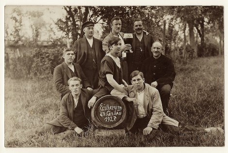 PORTRAIT OF EIGHT MEN IN THE GERMAN COUNTRYSIDE DRINKING BEER; ONE IS WEARING A DRESS (1927)