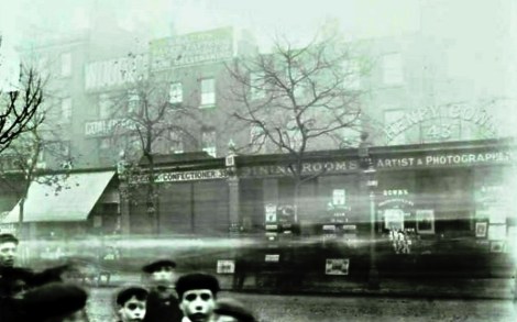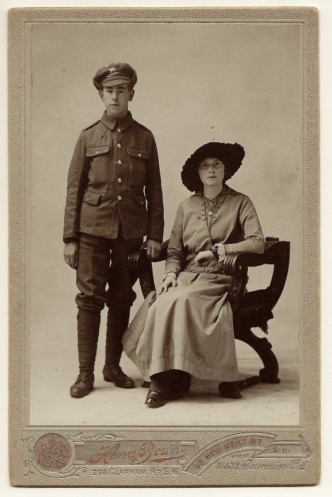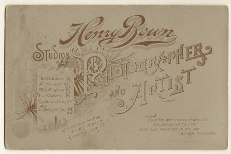 This cabinet card portrait features a young man in uniform and a young woman wearing a uniform type dress. The man’s cap has a patch that appears to show a horse and rider. The woman is wearing glasses as well as jewelry. Note her large watch. What is the story that goes with this lovely couple. Are they even a couple? They could be siblings. Is the young man wearing a military uniform? The previous owner of this photograph stated that this is a portrait of two telegraph workers. The man in uniform was described as a telegraph delivery boy (man). The website “Photographers of Great Britain and Ireland 1840-1940” tells the story of the photographer who produced this photograph. Henry Bown (1841-1921) began his career as a photographer sometime between 1871 and 1876. At the time that he produced this cabinet card, he had six photo studios around London. This photo came from his studio on New Kent Road. Henry had five sons involved in his business. In 1919, his son Charles Bown took over the business. A photograph of the New Kent Road studio can be seen below. (SOLD)