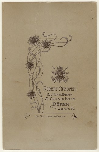 The parents of these five siblings must have been pleased when the photographer, Robert Ophoven, gave them this portrait. The children are beautiful, well dressed, and well posed. All three girls are wearing jewelry and their hair was carefully styled for this portrait. It is also interesting to note the intimacy between the three girls. the middle girl has an arm around the shoulders of one sister while her other arm is being grasped by her other sister. This image was photographed in Duren, Germany. SOLD