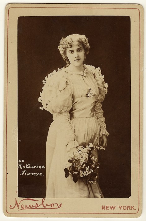 This cabinet card photograph features actress Katherine Florence (1874-1952). She was born in Birmingham, England and died in Astoria, Queens, New York. She received her education from a convent in Peekskill, New York. She furthered her education by studying in Paris, and later, Montreal. Florence was a popular American stage actress who performed from the late 1880’s through the early twentieth century. Her mother was a famous actress named Katherine Rogers. Two of Katherine Florence’s sisters became successful stage actresses Their names are Violet Rand and Eleanor Moretti. She gained her early acting experience in her mother’s theatrical company. Her major debut took place in New York City, 1887 in the drama, “As In A Looking Glass”. Lily Langtry was also in the production. She appeared on the New York stage every year of her theatrical career except one. Florence was married to stage actor Fritz Williams in 1892 and their marriage ended with his death in 1930. Her resume includes acting in “The Lost Paradise (1892)”, “The King’s Musketeers (1898”), and “Letty (1905)”. During her career she played opposite excellent actors including Stuart Robson, E. H. Sothern, and William Gillette. The Interned Broadway Data Base credits Miss Florence with appearing in fourteen productions between 1893 and 1913. This cabinet card was produced by Newsboy, a tobacco company. The photograph was used as a premium to encourage customers to buy the tobacco products.