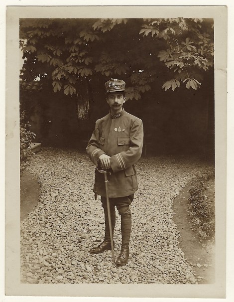 I wish I knew more about this soldier. This vintage snap shot features a European military man. My first guess is that he is a member of the French or Belgian army. I am hypothesizing that he is an officer. The evidence of his higher rank is the sword that he is carrying. The gentleman is wearing three medals. The number 1554 appears on his hat and on his collar. Is that the number of his regiment? The soldier appears to be standing in a manicured garden. This vintage photo measures about 3 1/2″ x 4 5/8″ and is in very good condition (see scans).