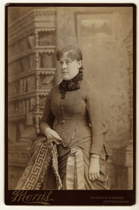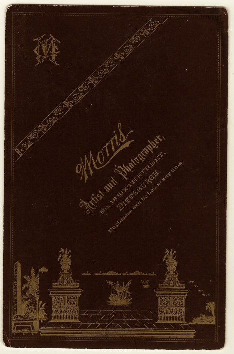 This cabinet card photograph features a fashionable young woman. Her plain dress is spiced up with a fancy collar and a sash. She is accessorized with two bracelets and what appears to be a chain and pocket watch. She was photographed by the Morris studio in Pittsburgh, Pennsylvania. United States census data reveals some biographical information about the photographer of this cabinet card. J. G. Morris was located in the 1880 census. He was about 29 years old and he and his father (David Morris) were both working as photographer agents. In 1900, Morris and his 18 year old son, Harry, were boarders, and the older Morris was working as a photographer while the younger Morris was employed s a photographer apprentice. The 1910 U.S. Census finds Morris still working as a photographer and living with his wife, Mary P. Morris. To view other photographs by Morris, click on the category “Photographer: Morris”. This cabinet card photograph is in very good condition. (see scans). (SOLD)