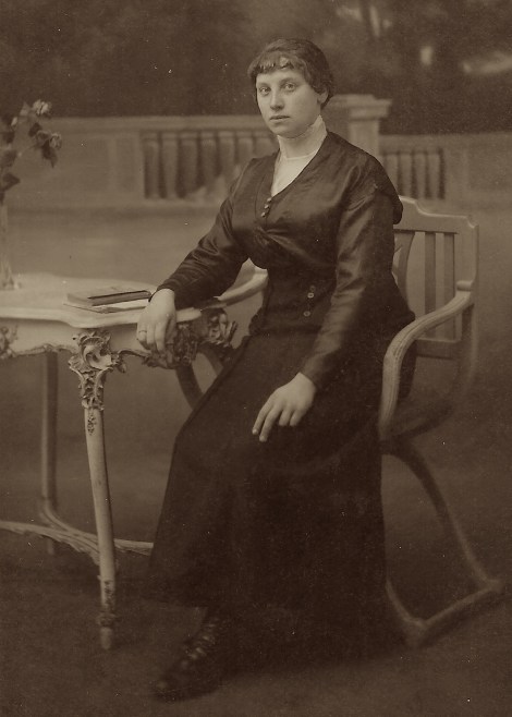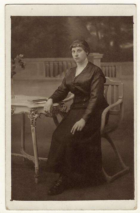This vintage real photo postcard features a buxom young woman seated at a table. A couple of books are atop the table. Note the woman’s high collar blouse. By appearance, she seems a bit uncomfortable being photographed. This postcard is in good condition (see scans).