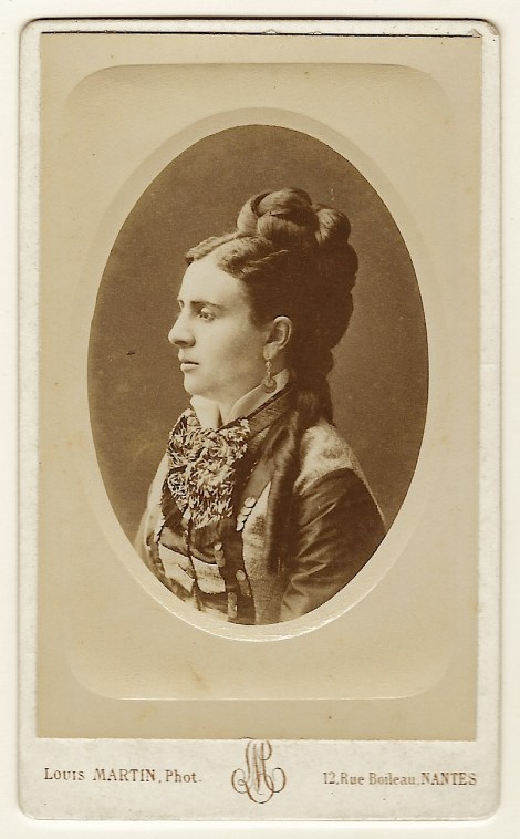This cartes de visite portrait features a woman posing for photographer, Louis Martin of Nantes, France. This profile view shows a well dressed and well coiffed subject. The cdv is an example of a bas relief photo (raised image providing a 3 dimensional effect). photograph. Nantes is a city on the Loire River and is located in the Upper Brittany region of western France. This photograph is in very good condition. (see scans).