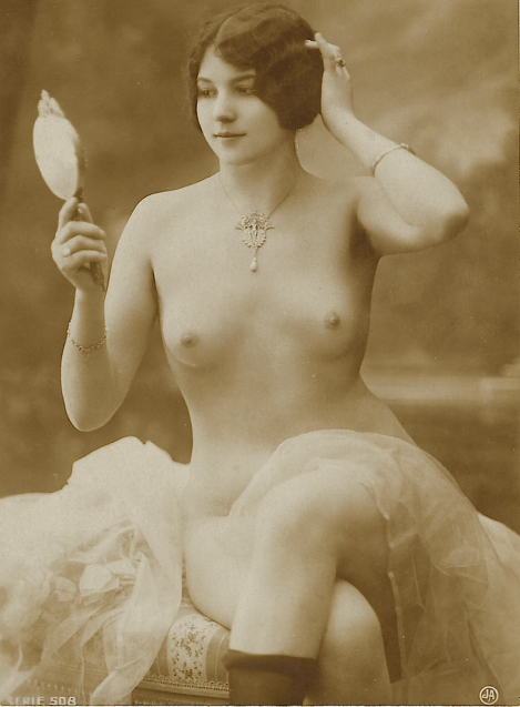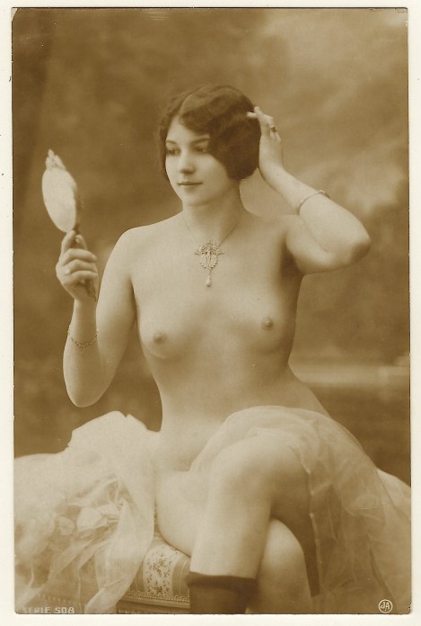 This vintage real photo postcard features a risque photograph of an unidentified model. The photo portrait was taken by the talented an esteemed French photographer, Jean Agelou (1878-1921).He was a photographer of the 1910’s and 1920’s and was well known for his erotic and nude photographs. He was born in Egypt and not much is known about his private life. Agelou generally used models between the age of 20 and 24 years-old. He had a favorite model. Her name was “Fernande” and in addition to modeling, she was Agelou’s lover. Her full name was Fernande Barrey (1893-1960) and she was a prostitute by trade. She also modeled for painters (Amadeo Modigliani and Chaim Soutine). Although the 1900’s was the “golden age” of erotic photograph, photographers who took such risque photos had to use discretion. As a result, Agelou signed his work “JA”. In 1908, nudity in photographs was banned in France and photographers needed to cover images of nude women with strategically placed undergarments or other materials. Nude images had to circulate on the down low. They were sent in the mail inside of envelopes. Jean Agelou died in 1921; the result of a car accident. His brother George, who managed Jean’s business, also was killed in the crash. This postcard is part of a series (508) . (SOLD)