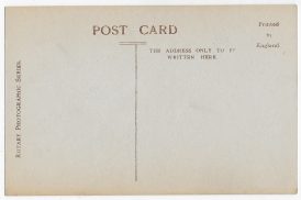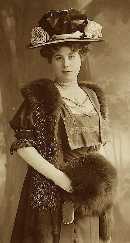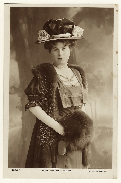 This vintage real photo postcard features actress Miss Mildred Claire. She is quite pretty and is dressed for cold weather (pre global warming). A fur muff protects her hands and a fur stole (pre PETA) wrapped around her shoulders. I could find very little information on this pretty actress. I learned from the Internet Broadway Data Base (IBDb) that Mildred Claire had acted in three Broadway shows between 1900 and 1905. I discovered little else. An actress named “Mildred Clair” appeared in a film titled “Treason” (1918). Perhaps this film actress was our Mildred Claire. There was also an actress named Mildred Claire who changed her name to Claire Rochelle and than had a successful film career. I do not believe the two “Mildred Claire’s” are one and the same person because Claire Rochelle was born in 1908, too late to be an adult when this postcard was issued. This portrait postcard was published by Rotary Photo as part of a series (no.4373 C). It was part of the Rotary Photographic series. The postcard is in very good condition (see scans). (SOLD)