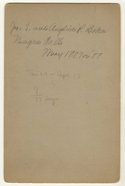 This cabinet card photograph is both interesting an unusual. The photo features a well dressed couple sitting at the edge of Niagara Falls. Af first, I thought that they were actually posing at a photographers studio with a excellent photo backdrop. I have since questioned my hypotheses. The pair are sitting on short chairs atop some rocks at the edge of the Niagara River. The gentleman’s shoes appear to be in very shallow water. The appearance of the waters edge and the realism of the background, makes me think they are actually being photographed outside and at the water’s edge. The reverse of the cabinet card has an inscription revealing that the couple’s names are Joseph and Angelica (Angeline?) Baker and that the photograph was taken in either 1887 or 1888. The photographer is unidentified.  (SOLD)