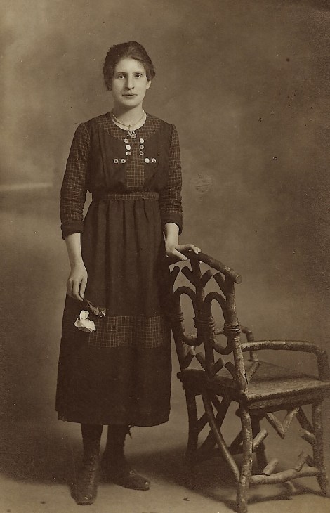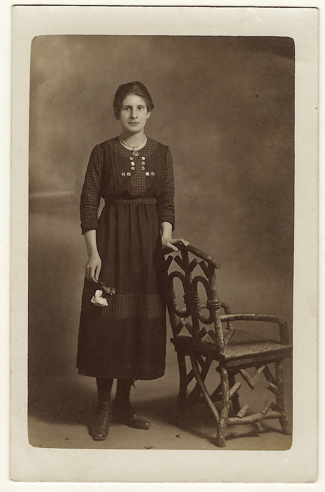 This vintage real photo postcard features a young woman holding a single stem and flower. She is wearing a necklace and pendant. She is dressed in a pretty dress with an abundance of buttons. Note the checkered pattern which appears on her blouse and midway down her skirt. Subtle, but nice. She is holding onto an interesting chair. The message on the reverse of the postcard seems to be introducing the woman as “Annie Marie Auge”. I am unsure if I deciphered her last name correctly. The message also reveals that the woman is twenty-two years old. This postcard is in very good condition (see scans).