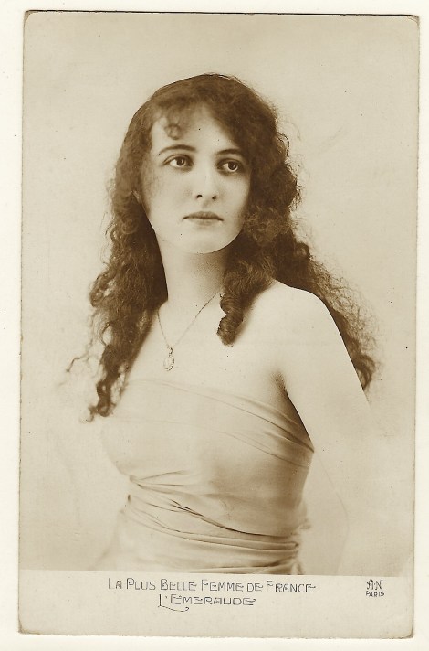 This vintage real photo postcard is part of a series named “Les Plus Belles Femmes de France” (The Most Beautiful Women of France). This series is titled “L’Emeraude” (The Emeralds). There were a number of different series published associated with “Les Plus Belles Femmes de France”. As advertised, the model for this portrait is truly beautiful. This postcard was published by well known and acclaimed photographer, Alfred Noyer. His Paris studio operated between 1910 and the 1940’s. Many of the postcards he produced featured nudes or risque images. ADDENDUM: The beautiful woman in this photograph has been identified. I stumbled upon her name while researching another postcard portrait (Miss Hungary) from the 1930’s. This enchanting woman is Agnes Souret (1902-1928) and she was “Miss France” in the inaugural Miss France contest of 1920. She was a actress and a dancer.She was French-Basque and born in Biarritz. She was the daughter of a former ballet dancer. The 5″ 6″ dark haired, brown eyed Souret became “Miss Midi-Pyrenees” in 1919 and then won the “La Plus Belle Femme de France” contest in 1920. This contest morphed into the “Miss France ” competition. The photo on this postcard is from the “La Plus Belle Femme” contest. She was just seventeen years old when she was in this contest. There were over two thousand entrants. Le Figaro stated that she was a “dazzling beauty”. The New York Times called her “the fairest in France”. The publicity about her pageant victories resulted in her becoming very popular in France. Photographs of her appeared in many journals and magazines. She also was covered by the gossip columns of the 1920’s. She appeared as a dancer in the Paris music hall, Folies Bergere and at the Opera de Monte-Carlo. She also acted in two “forgettable” films (1920 & 1921). Souret travelled to England and was in Revues at the Gaiety Theatre in London. She was invited to Hollywood for an audition to appear in films in 1922. No film offers were made. She published a book in 1922. It was entitled “The Famous Book of Beauty Secrets” and published by a Chicago company. Souret led a short life. She died of peritonitis at the age of 26 while touring Argentina. SOLD