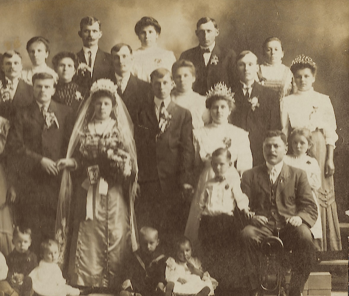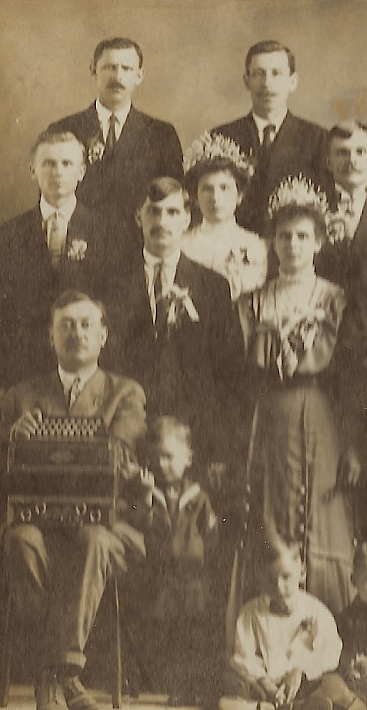 This cabinet card photograph was purchased in the Texas Hill Country but was taken at a wedding in Northhampton, Pennsylvania. This group is the “mother” of all wedding parties. The bride is wearing a dark wedding dress and four of the women are wearing tiaras. Some of the children are holding dolls. Note the accordion player sitting in the bottom row. Apparently he was supplying the entertainment at the wedding reception. This cabinet card was photographed by Thomas Lenhart. He operated a studio in Northampton, Pennsylvania. The cabinet card gallery has other images from Mr. Lenhart’s other studio. It was located in Allentown, Pennsylvania.