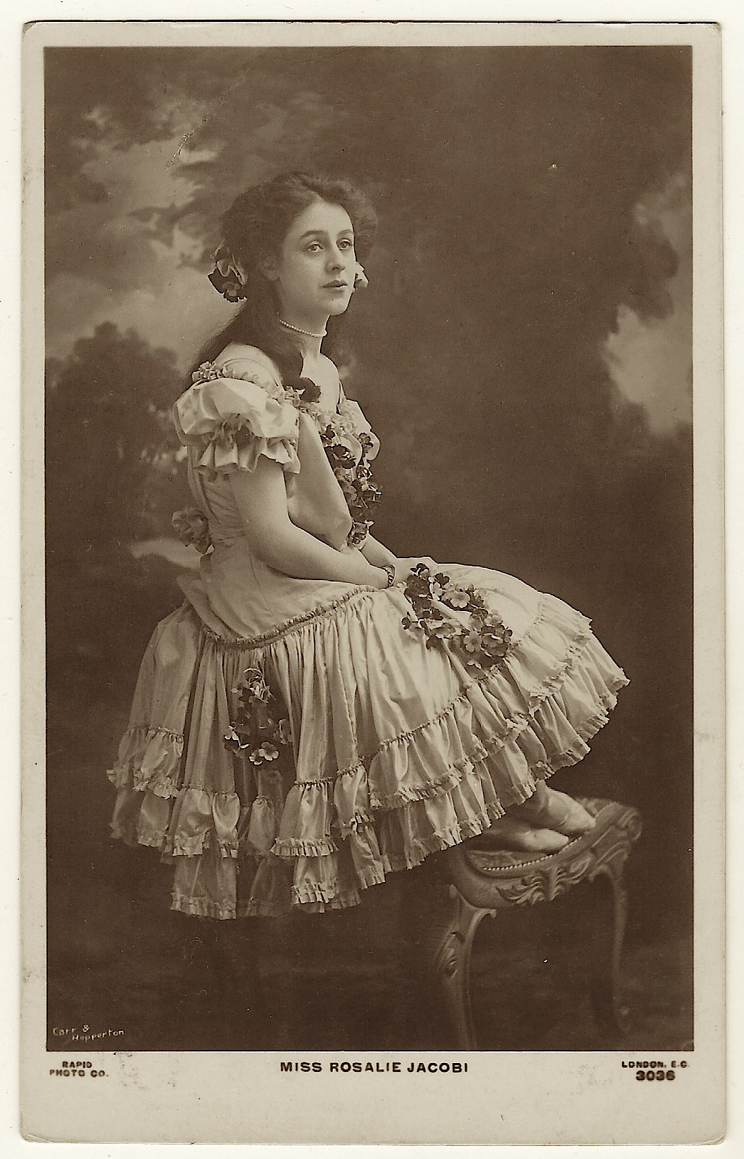 This real photo postcard features actress Miss Rosalie Jacobi. Little information could be found about her and this particular postcard is very uncommon. Miss Jacobi appeared in the 1900 production of “Herod” which was produced at “Her Majesty’s Theatre” in London, England. Actors in the play included Maude Jeffries and Beerbohm Tree. The Sketch (1900) has an article about the play “Bonnie Dundee”, which appeared at the Adelphi Theatre. The review praises Rosalie Jacobi and labels her as a “child actress”. The article also states that she gave a “remarkably talented performance”. The photograph on the face of this postcard is from 1906 (see the postmark) and it is likely that the photo was taken when Jacobi was in her teenage years. The postcard was published by Rapid Photo of London as part of a series (no.3036). The photographer was Carr & Hopperton. This vintage postcard is in good condition (see scans).