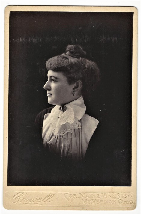 This cabinet card portrait features a pretty young woman posing for a photograph at the Crowell Gallery in Mount Vernon, Ohio. Her hair is wrapped in a bun and she is wearing a lace scarf and a pin. The photographer of this photo portrait is Fred S. Crowell. The Cabinet Card Gallery (CCG) has at least two other photographs by Mr Crowell. Based on the photographs in the CCG collection, he was a talented photographer. His name can be found in the 1880 census. He was born in 1844 and lived with his wife Ella, and their three children. Other research reveals that there was a Fred Crowell from the Mount Vernon area who enlisted in the 142nd Regiment of the Ohio Infantry during the Civil War. He served only during 1864. Crowell trained as a photographer under Anna Payne, and worked in the profession in Norwalk, Sandusky, and Cleveland, Ohio. He then opened his own studio in Fredericktown in 1866. In 1869, he moved to Mount Vernon where he established a photography studio that was in business until at least 1889. This cabinet card photo is in good condition (see scans)