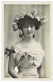 The beautiful woman in this vintage real photo postcard is Millie Legarde. She was an actress and a singer. She was active in her career between 1898 and 1911. She was a sitter for eight portraits in Great Britain’s National Portrait Gallery. She performed in numerous theater productions and in one film (1905). Searching for biographical information about Miss Legarde was like looking for a needle in a haystack. Preliminary research revealed that she appeared in many plays. Newspaper articles of the time, mention her name, but provide little information. It’s as if she was in the “witness protection program” and nearly all information about her has been scrubbed. Millie posed for a number of postcards but this card is certainly the nicest one I’ve seen. This postcard was published by Ralph Dunn & Company which operated out of London, England. The card is part of a series (no.A476). The postcard was manufactured in Berlin, Germany. (SOLD)