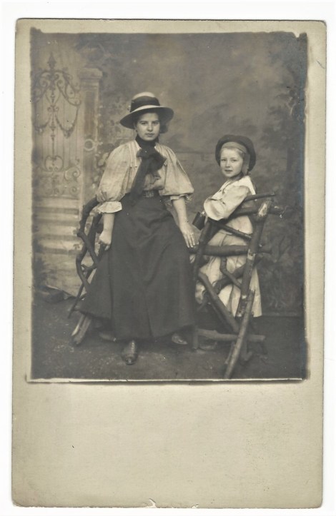 This vintage real photo postcard features what is likely two sisters posing for their studio photograph. They offer a study in contrast. Big sister is nicely dressed but appears very uncomfortable having her photograph taken. The younger sister seems more relaxed, and even spunky, as she smiles at the camera. She is holding either a small pail or a purse in her hand. This photo portrait postcard is in very good condition (see scans).