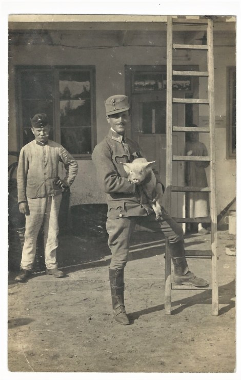 This vintage real photo postcard features a uniformed World War I soldier holding a piglet in his arms. The soldier’s smile makes me nervous. Does he have some culinary plans for this cute pigling? The soldier has two observers. A mustachioed military man stands behind him and a woman is peering through a doorway at the soldier with the pig. The piglet carrier is wearing a pin on his lapel. Is he an officer? What country does he represent? My guess is that he is a member of the Austro-Hungarian military. It is just my best guess based on insufficient research. This postcard is in good condition (see scans).
