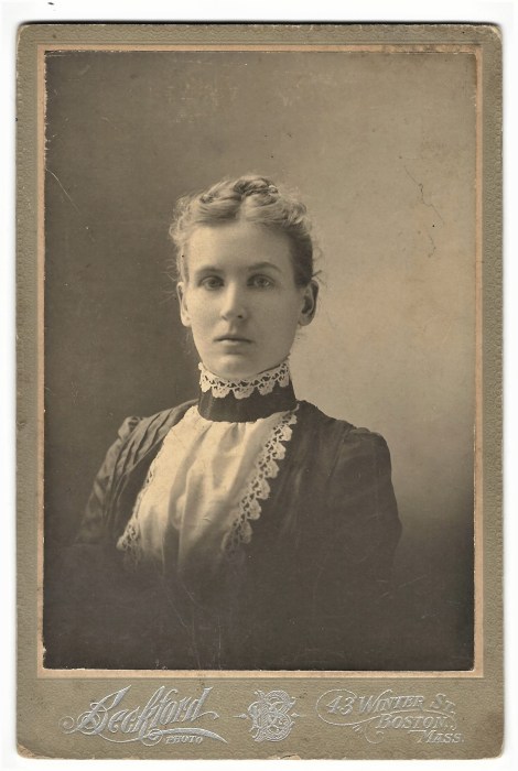 This cabinet card portrait features a well-dressed pretty young woman. Her high collared dress includes lots of lace. She is wearing a serious expression. She appears to be in her teenage years or slightly older. This photograph was taken by the Beckford Photo, a studio located in Boston, Massachusetts. David C. Beckford received mention in the book, “Boston: Its Commerce, Finance, and Literature”. His studio is described as a leading photo studio in the country. The business was established in around 1872 as the Chickering Photo Company. The proprietor, Walter E. Chickering (not to be confused with Elmer Chickering, a well respected Boston photographer of the era) was a notorious swindler. He was especially known for his dishonesty and blatant resistance to paying his bills. Walter must have been a tough boss to tolerate. Beckford took over the business in 1888. Beckford’s establishment employed four assistants. Beckford was a native of Jamaica. He came to Boston in about 1872 and worked for Chickering for several years. According to one source, Beckford operated a Hardware business in Jamaica, at least part of the time, while he ran his photo studio in Boston. A Massachusetts directory of photographers asserts that Beckford was active as a photographer until 1909. Beckford is cited in an article appearing in the “Southern Workman” (1909). The title of the article was “Improvement in Housing Negroes in the North”. The writer states that Beckford had recently returned from a business trip to Jamaica where he directed the rebuilding of his properties; and reestablished his hardware business which had been destroyed in an earthquake. The “Southern Workman” article was the first reference that I found that indicated that David C. Beckford was a Black man. Examining the 1900 US census data provided confirmation that Beckford was indeed a Black man. Census data conflicted with other legal documents in regard to where Beckford was born. It appears he was born in either England or Jamaica. He was born in 1856 and immigrated to the United States in 1872. He married Elvira P. Gott in 1881. She was a Black woman born in Massachusetts. She was close in age to Beckford. Photographs by Black photographers are not common, making this image a great find. This cabinet card portrait is in fair condition (see scans). Note the presence of peeling along the left and bottom border of the card mount. The image itself has excellent clarity and is in good condition. (SOLD)
