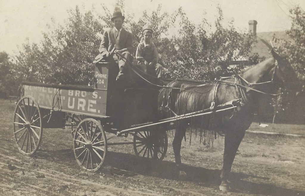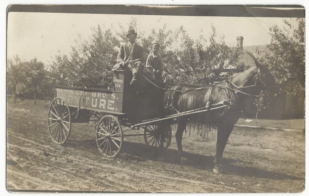 This vintage real photo postcard features a father and son on a horse drawn wagon. This is no ordinary wagon. Instead, as the painted sign on the side of the wagon states; it is the delivery wagon for the McMullin Brothers furniture store. The business was located in Anthony, Kansas. Research reveals that one of the McMullin brothers was Joseph Franklin McMullin (1857-1914). He can be found in the US Census of 1910 and his occupation is listed as the proprietor of a furniture store. Ten years earlier, the 1910 US Census reports that Joseph McMullin was working as a farmer, despite the fact that in 1909, the local newspaper, “The Anthony Republican”, ran an ad for McMullin Brothers furniture store. This photo postcard represents a piece of both Anthony and Kansas history. It is also a record of the workings of small business at the beginning of the twentieth century. Note that there is no furniture in the rear of the wagon. It is likely that the wagon and its driver and young assistant, presumably father and son, took the wagon out for the specific purpose of being photographed. The father is wearing nice clothing, not work clothes, which supports the theory that he was not photographed while on the job. This postcard’s AZO stamp box indicates that it dates back to between 1904 and 1918. SOLD