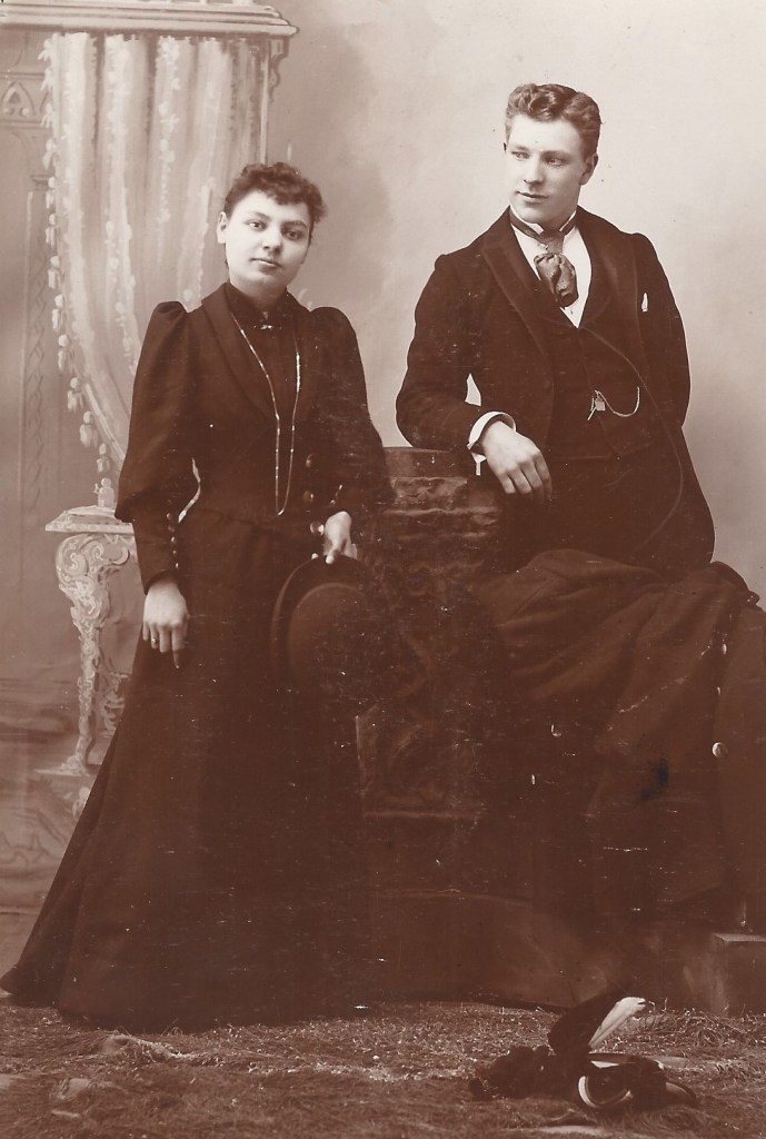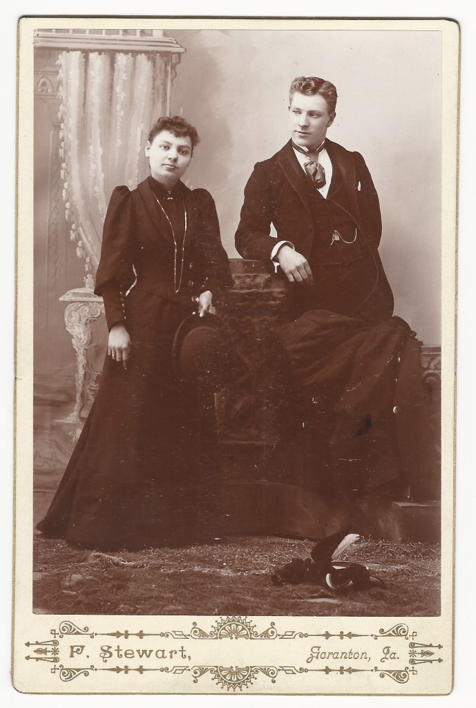 This cabinet card portrait features a young man and woman posing for their portrait at the Stewart studio in Scranton, Pennsylvania. Presumably, the couple are husband and wife. This is an interesting and unusual photograph. Note the man’s facial expression as he stares at his wife. I have been struggling to find the precise words to interpret his countenance. The best way that I could describe his expression is “incredulous bemusement”. He is looking at his wife out of the corner of his eye and seems amazed. I see no intimacy between this marital pair. They appear entirely disconnected. The woman’s feathered hat is on the floor in front of the couple. Interestingly, the man’s hat is given better treatment than the woman’s hat. The woman is holding her husband’s hat and keeping it off the dirty ground. The idea that she has to be the keeper of her spouse’s hat seems a bit subservient. However, we have to remember that this photograph was taken over one hundred years ago and gender roles were far different that they “generally” are today. SOLD