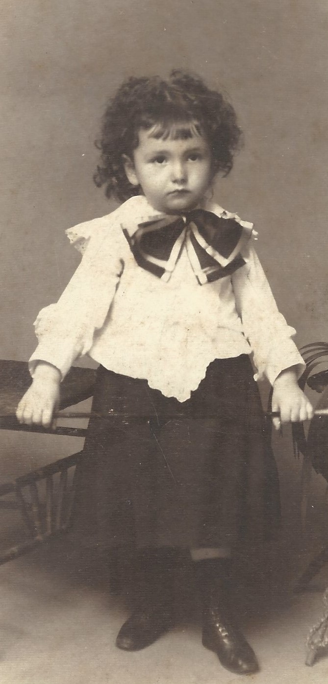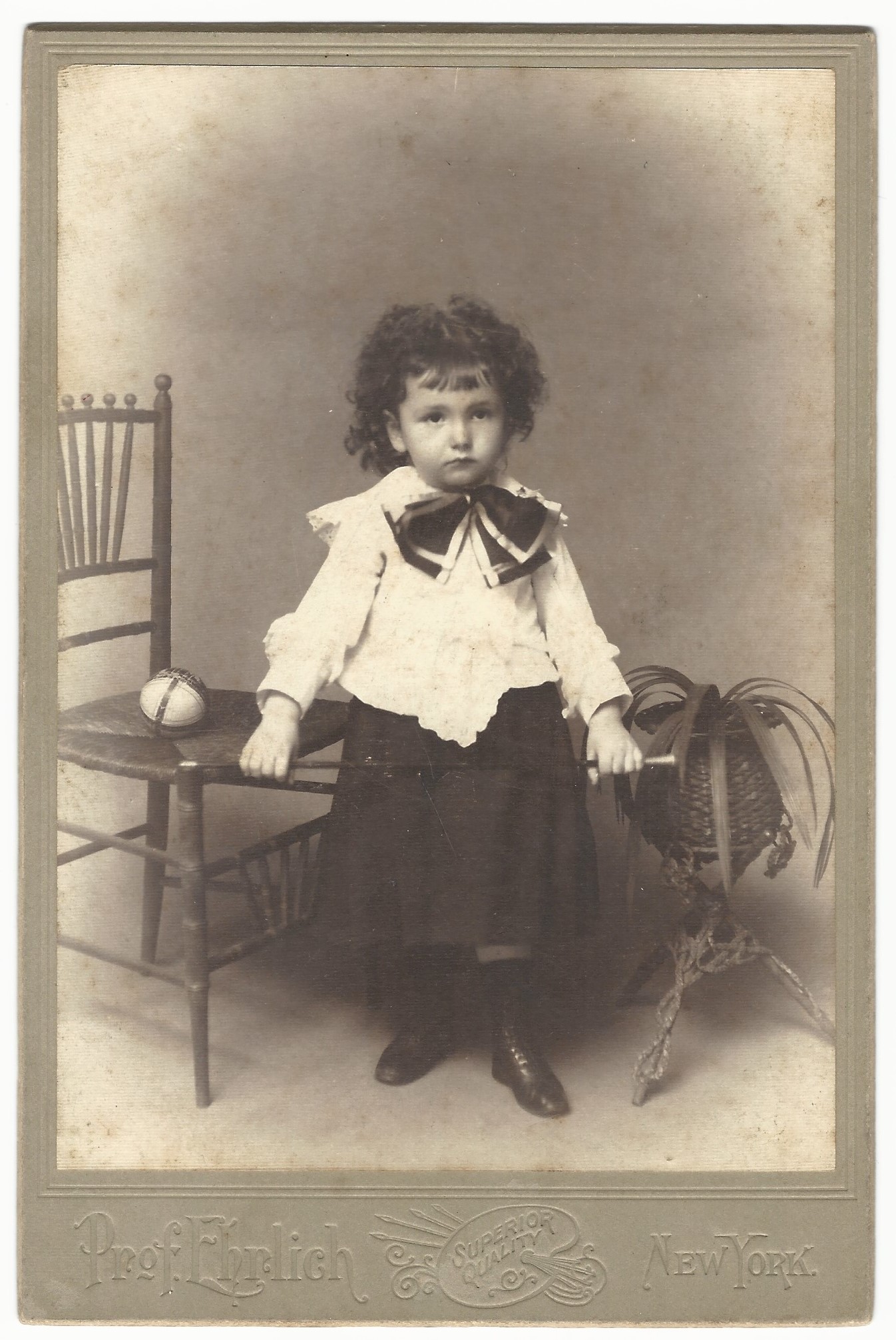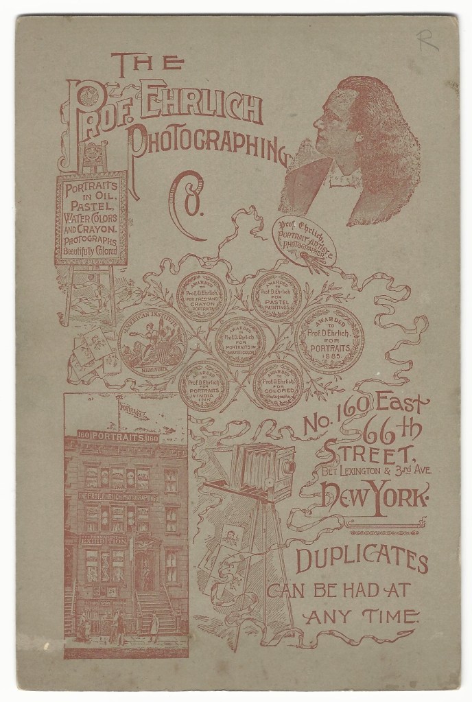 This photograph of a young child is from the studio of Professor David Ehrlich of New York City. The child is beautifully dressed and is holding a toy in his left hand and standing beside a chair with a toy ball on the seat. A sketch of Prof. Ehrlich and a sketch of his studio can be found on the reverse of the photograph (see scan below). The author of the blog, “Cabinet Card Photographers”, has researched Professor Ehrlich. It was found that Mr. Ehrlich had a photo studio at 160 East 66th Street between 1892 and 1902. In 1902, he appears to have moved his studio to 157 East 75th Street. He made a number of moves after that. He is last listed as a photographer in a 1913 business directory. He then switched professions and became a music teacher. The Professor must have possessed a strong drive to teach. While a photographer, he gave photography lessons to the public. It seems that he truly earned the title of “Professor”. This cabinet card portrait is in very good condition.