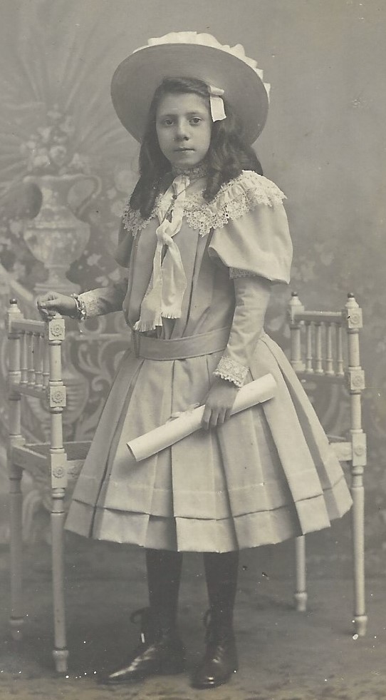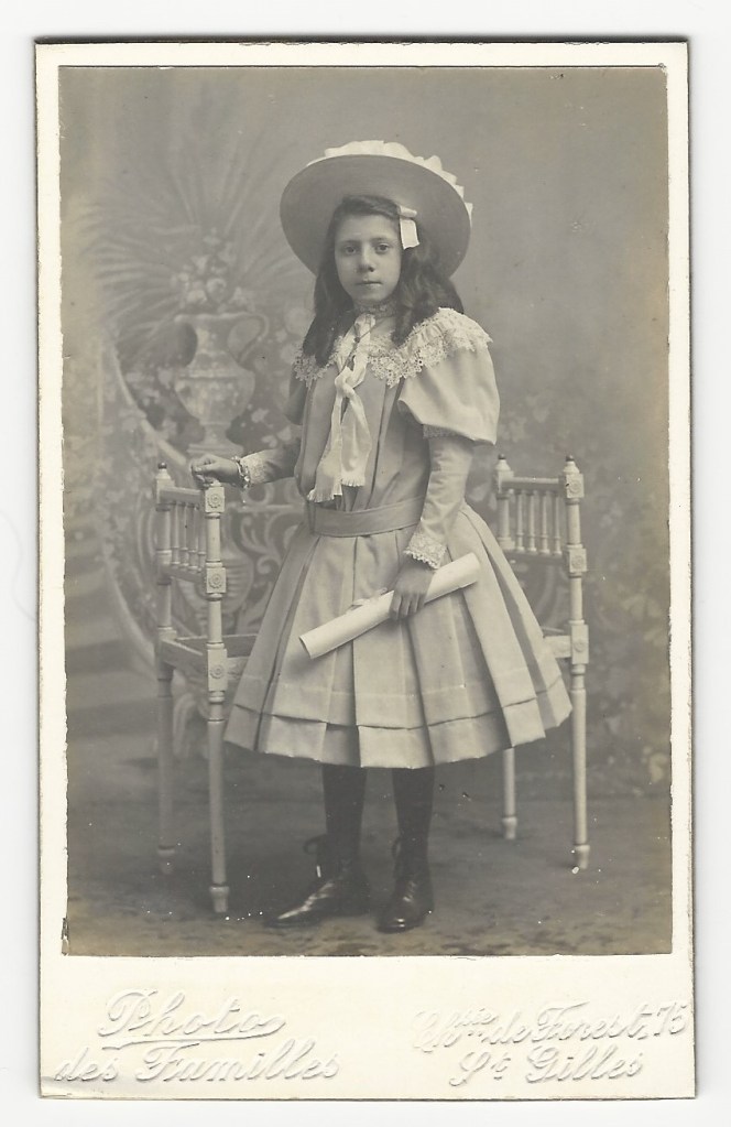 This carte de visite portrait features a well dressed young girl holding a long rolled piece of paper. Is it a graduation certificate? She was photographed by the Family Photo studio located in St. Gilles, Belgium. The community of St. Gilles is a municipality located in the Brussels capital region. There is also a St. Gilles in France. However, that French community is named “St. Gilles-du-Gard” and is located in southern France. SOLD