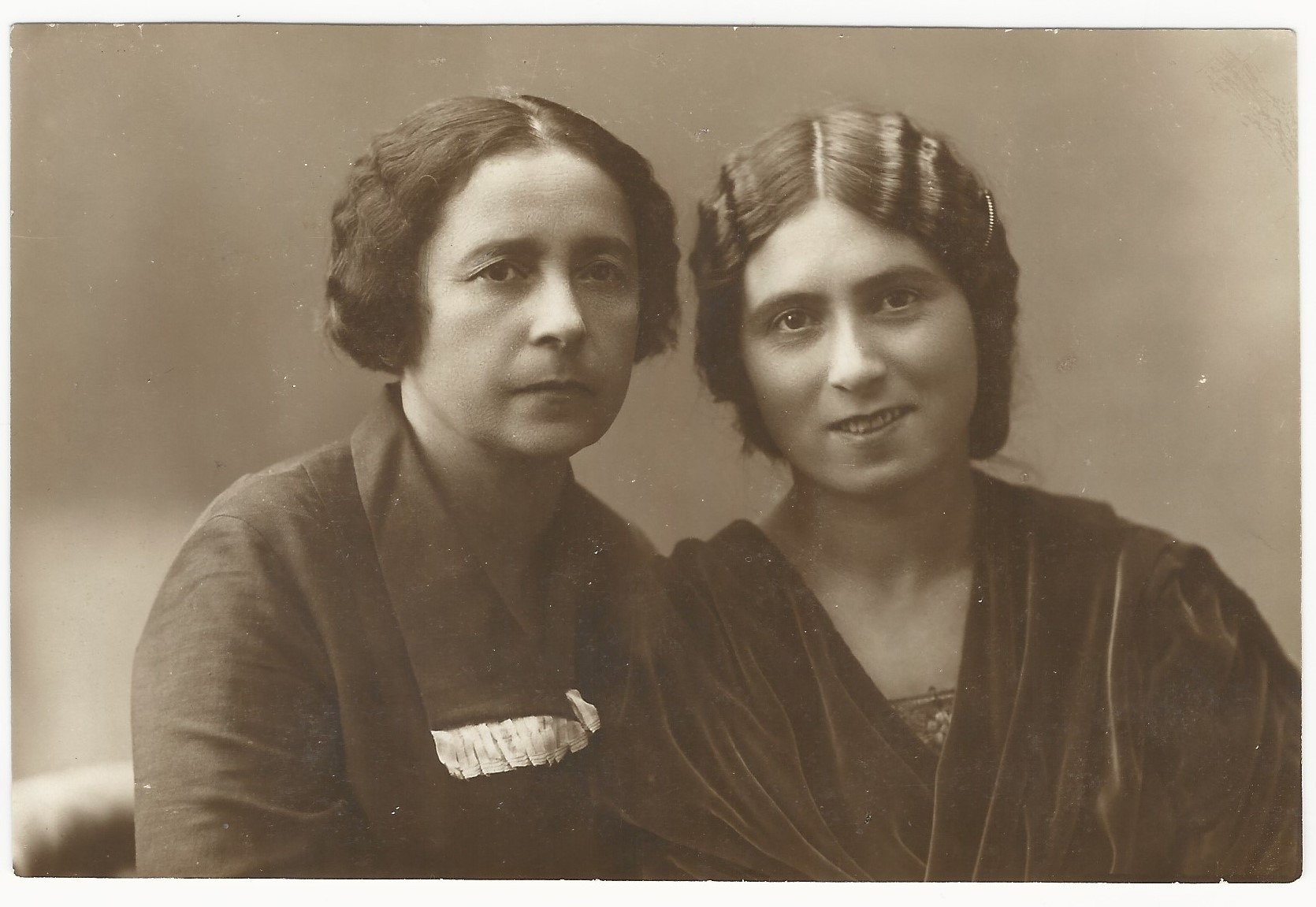 This vintage photograph features a close-up portrait of two women. My opinion is that the two ladies are mother and daughter. An interesting aspect of this photo is that the image presents contrasting emotions. The mother appears intensely serious. She is absolutely not relaxed. The daughter presents a sweet smile and a happy mood. She appears relaxed and well poised in front of the camera. This photograph measures about 5 1/2″ x 3 5/8″ and is in excellent condition (see scans).