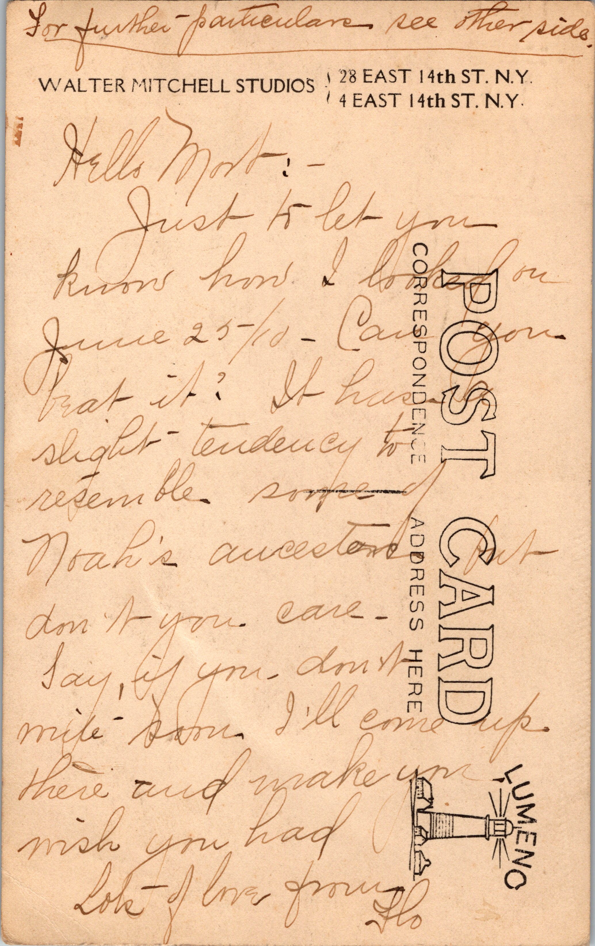 This vintage real photo postcard features a portrait of a young woman named Flo. She is sending this photograph to a friend, with a message that states that this is “how I looked on June 25th, 1910”. This photo was taken at the Walter Mitchell Studio, located on East 14th Street in New York City. The card has a Lumeno stamp box with a lighthouse logo. (SOLD)