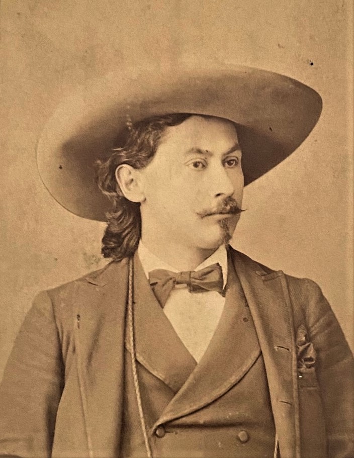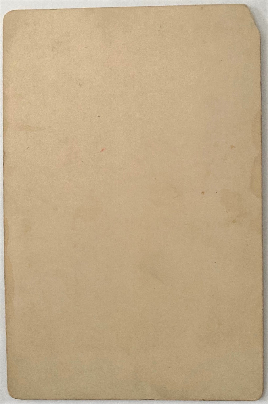 This cabinet card photograph features a Michigan cowboy. If he is not a cowboy, he certainly is wearing a cowboy-like hat. This fellow has long hair. It is unusually long hair for the cabinet card era. The photographer of this portrait is Obadiah A. Kelley. He was a photographer in Ann Arbor, Michigan from at least 1862 and 1898. He was located at the 6 Huron Street address from 1886 until 1893. He was born in Vermont. He married Mary Elizabeth Frost in 1842. The couple had three sons. One son enlisted as a private in the First United States Sharp Shooters (Company F) and died of disease at City Point, Virginia in 1864. He served only slightly more than a month before meeting his end. Obadiah’s wife died in 1879. In 1880, he married Amelia Walker. An 1889 article in a local Ann Arbor newspaper, “The Argus” reports Obadiah’s brush with the spiritual world. A resident clairvoyant believed that the spirits were active in her community. To test her conviction, she hired Obadiah to accompany her and a friend to “one of the most romantic parts of the boulevard” and take their photograph. The newspaper reports a strange occurrence upon Obadiah removing the negative from the camera. He was shocked to see twelve figures in the photo, rather than the two figures he expected. The writer posits that Obadiah could never be convinced to take any more pictures on the boulevard again if there were any clairvoyants around. Note the chip in the top left hand corner of this cabinet card. Overall, this photograph is in good condition (see scans). (SOLD)