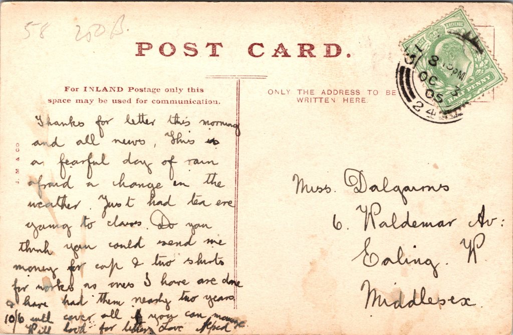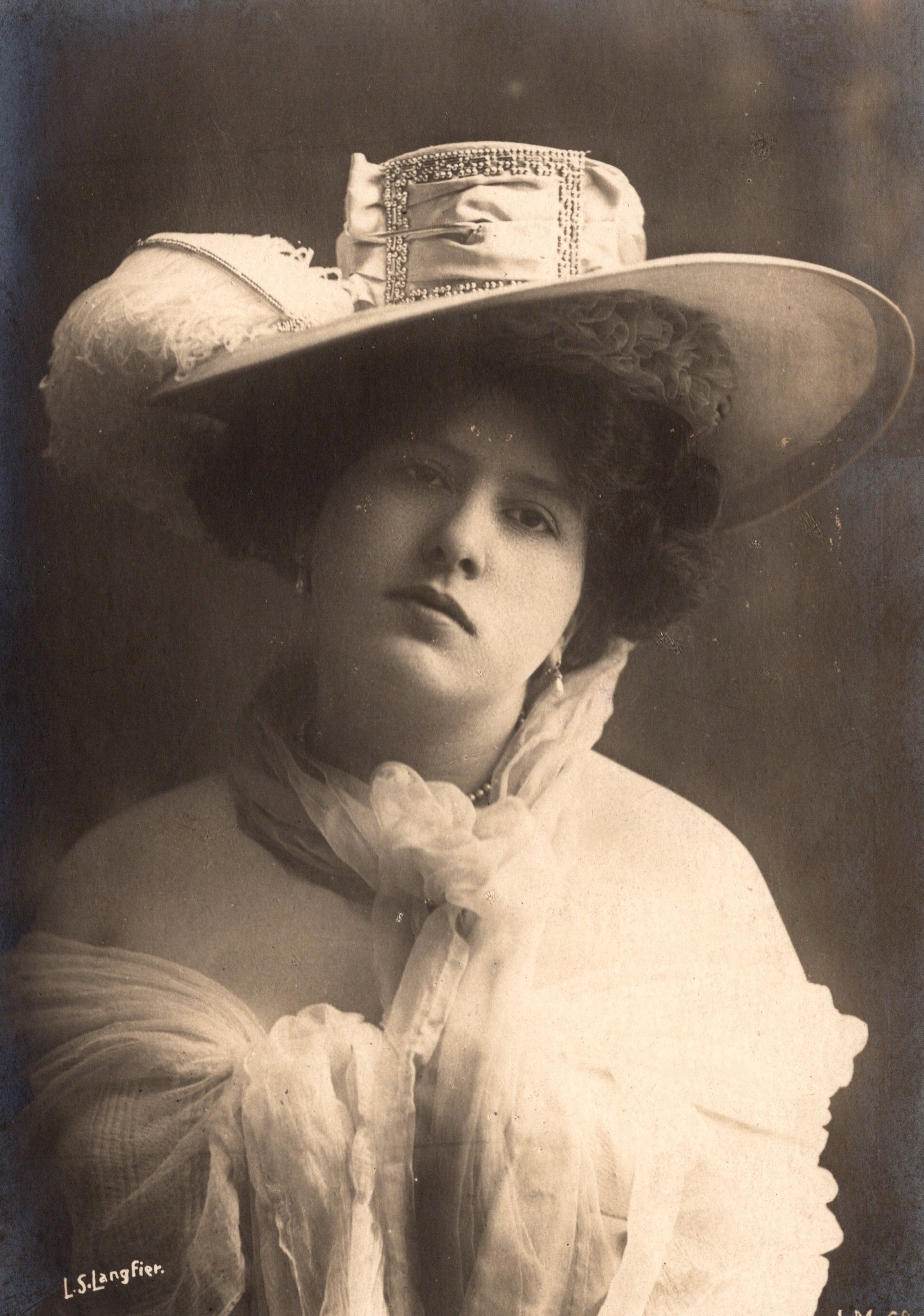 This vintage real photo postcard features actress, Pearl Lyndon. She used a variety of other names including Madame Rosario. It is interesting to note that she was the wife of the photographer who took the photograph for this postcard. The photographer was Louis Saul Langfier.The pair married in 1903. This postcard is rare and information about Miss Lyndon is sparse. She grew up in Scotland. She ran a theater school for young children. She taught music and dance and claimed to be a professor. In 1920, a police news magazine reported that the and a live in man, were assaulted by their housekeeper and her son. The housekeeper denied the charge and said that Pearl was trying to engage her employment at a nightclub and criminal activity. There was another report of Pearl being attacked. She suffered broken teeth and was threatened by a man with a revolver. The assault took place in a dance club.By 1920, she and her live-in partner were running a London dance club that drew much attention from the local police. She was fined for selling alcohol without a license. Someone at the hearing referred to her establishment as a “disreputable place”. Pearl added more clubs to her portfolio and at least three of her clubs were raided by the police. There were reports that opium was being sold at her clubs. In 1924, at age 36, Pearl was arrested by the police in Fife, Scotland. She and her partner had split up, and he accused her of harrassment, and assault. He claimed she hit him on the head with a hammer, knocking him out. He stated she then turned on the gas in an attempt to kill him. She was also accused of hiring two men to threaten her ex with a razor. It was a “he said. she said” trial but at the end, Pearl was sentenced to two months in jail. When she was released from her imprisonment, she disappeared from the newspapers. It is interesting that research revealed much of Pearl’s nefarious behavior, and none of her history on stage. I find that quite sad. This vintage photo portrait postcard is in fair condition (see scans).