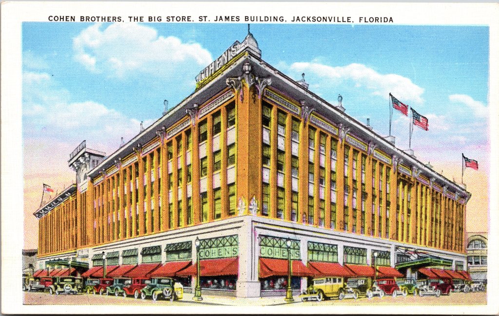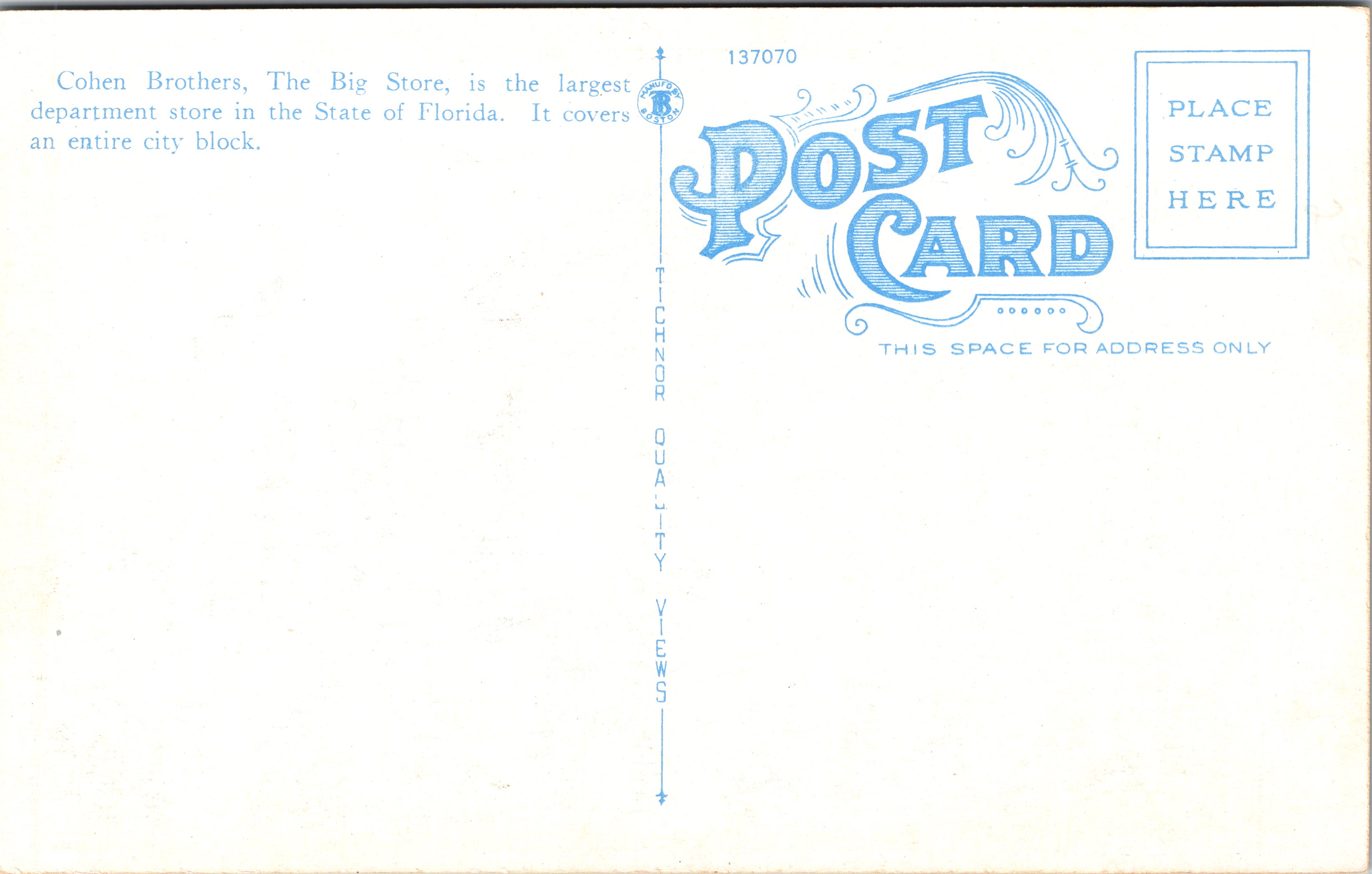 This vintage postcard features the Cohen Brothers Department Store in Jacksonville, Florida. The store was known as “The Big Store” and this postcard shows the business occupying a full city block. Note the antique cars parked on the streets bordering the store. Cohen Brothers was founded by Samuel and Morris Cohen in 1867. They were later joined by their brother Jacob. In 1959, the business was bought by May Department Stores and was renamed, May-Cohens.The business was sold due to a slumping downtown business environment and the high costs necessary to operate the “Big Store”. The business was permanently closed in 1987. The card was published by Tichnor Quality Views. SOLD