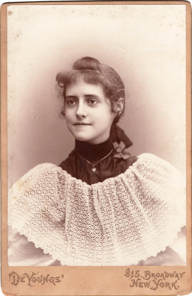 A pretty teenage girl poses for her portrait at the DeYoungs’ Studio on Broadway in New York City. She is fashionably dressed. She is wearing her hair up and it is nicely styled. Note the ribbon in her hair and the necklace arouhd her neck.The charm on her necklace appears to be heart shaped. An inscription on the reverse of the photo identifies the girl as “Agnes Adams”. The photographer, Joseph DeYoung (1843-1919), was both well known and highly respected. He had operated his studio from a number of addresses in New York City. He left the 815 Broadway address, where this photograph was taken in about 1890. He was at that location from at least 1884. In 1907 DeYoung’s studio was involved in the apprehension of a noted thief. The studio had a display case outside the store so pedestrians could see samples of their work. The thief was caught jimmying open the case and removing two sports photographs. The police were very interested in the home address given to them by their new arrestee. They were surprised that he lived in a mansion but it made sense when they learned he was a millionaire’s butler. He had worked in that same capacity for other millionaires living in the city. When the police searched his room, they found a cache of personal items belonging to his current and former employers. Years later, a deceased DeYoung made the news because of his bizarre estate planning. When he died, he left five dollars to his wife, five dollars to his son, and one half of his business to his business partner, Matilda Wallace. (SOLD)