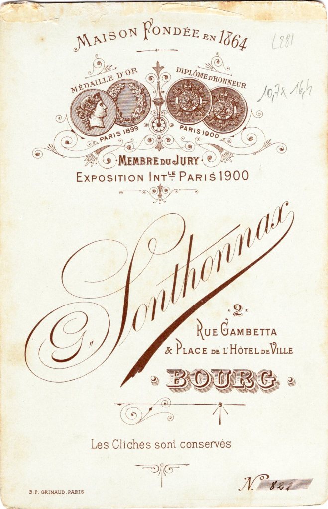 This cabinet card photograph features two pretty fashionable women posing for their portrait at the Sonthonnax studio in Bourg, France. The women are likely sisters. They are similarly dressed and have sweet smiles. Their lovely hats have both feathers and ribbons. (SOLD)