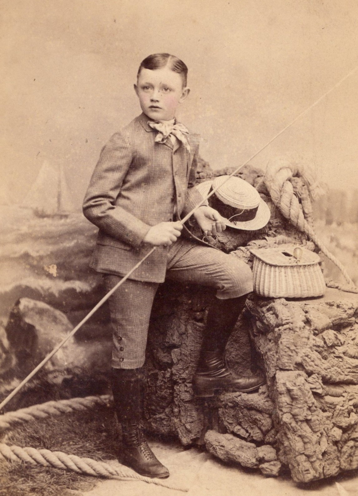 A fashionable young boy poses for her portrait at the DeYoungs’ Studio on Broadway in New York City. The faux setting is a beach scene. The boy is wearing a suit accented by a bow tie and boots. His straw hat and picnic basket rest on a large rock beside him. The photographer, Joseph DeYoung (1843-1919), was both well known and highly respected. He had operated his studio from a number of addresses in New York City. He left the 815 Broadway address, where this photograph was taken in about 1890. He was at that location from at least 1884. In 1907 DeYoung’s studio was involved in the apprehension of a noted thief. The studio had a display case outside the store so pedestrians could see samples of their work. The thief was caught jimmying open the case and removing two sports photographs. The police were very interested in the home address given to them by their new arrestee. They were surprised that he lived in a mansion but it made sense when they learned he was a millionaire’s butler. He had worked in that same capacity for other millionaires living in the city. When the police searched his room, they found a cache of personal items belonging to his current and former employers. Years later, a deceased DeYoung made the news because of his bizarre estate planning. When he died, he left five dollars to his wife, five dollars to his son, and one half of his business to his business partner, Matilda Wallace. (SOLD)