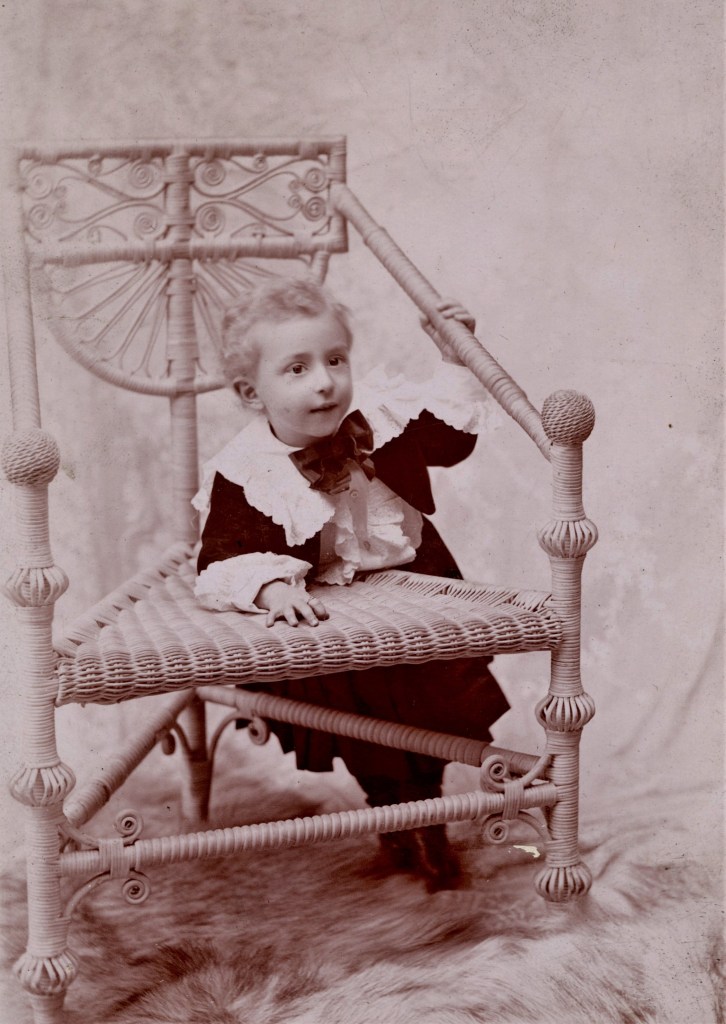A child dressed in fashionable clothing poses for his photograph at the Frey studio in Syracuse, New York. The child is displaying a smile. He is leaning against a wicker chair. Vincent Frey (1837-1916), the photographer, was born in Germany and died in Syracuse. He was a photographer in Syracuse for more than 30 years. The cabinet card is in overall Good Condition (see scans).