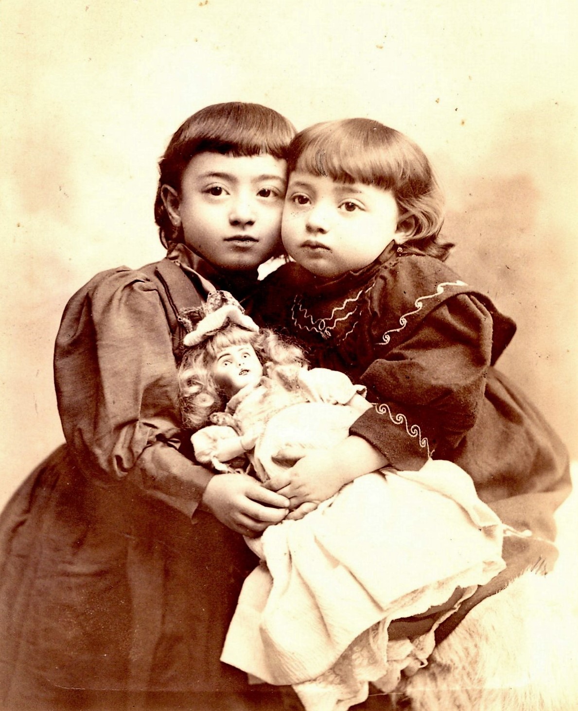TWO ADORABLE SISTERS : PRETTY DOLL : NEW YORK CITY : CABINET CARD PORTRAIT