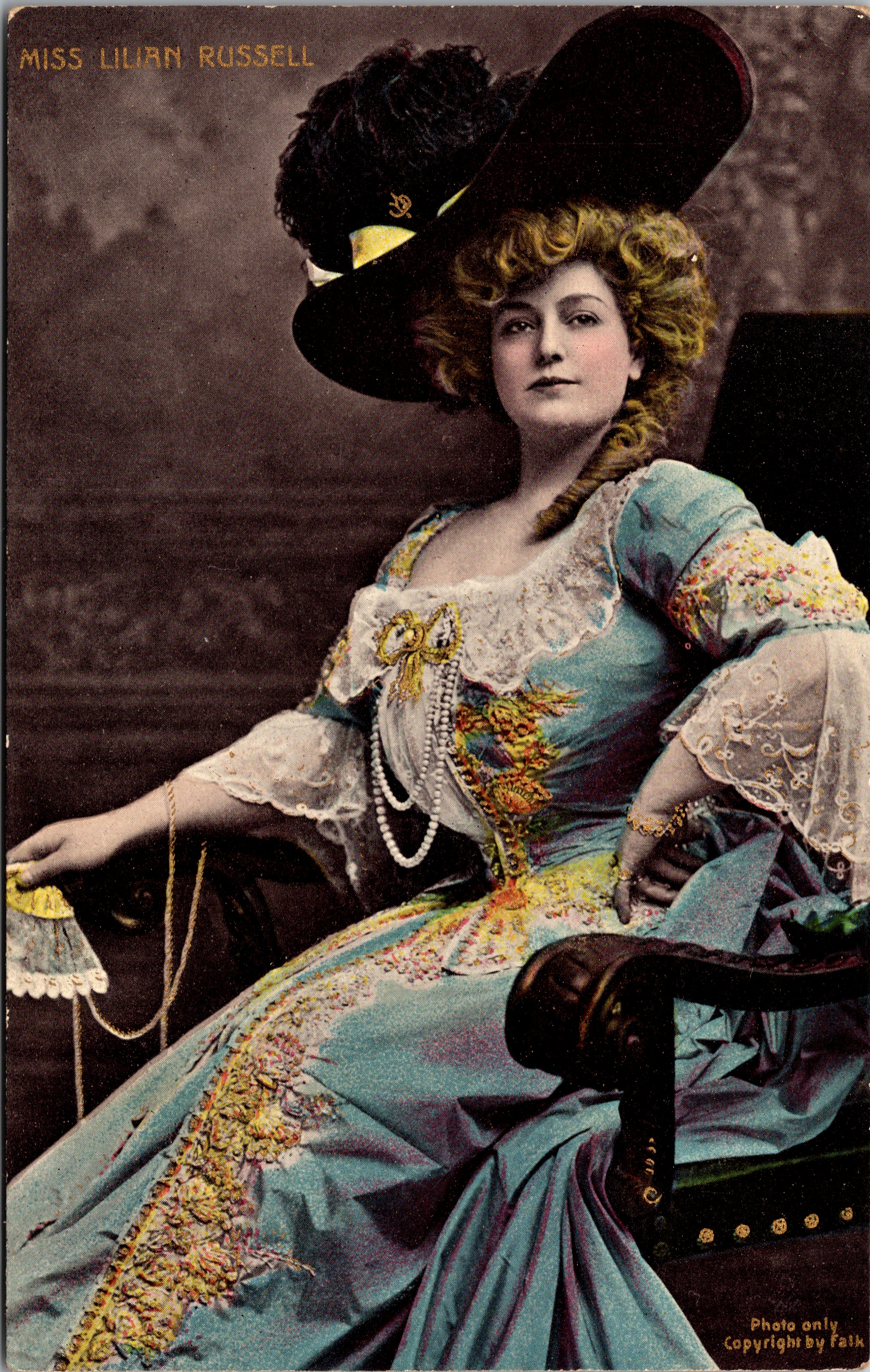 Lillian Russell (1860-1922) is pictured in this vintage lithographic postcard by famed New York celebrity photographer, B. J. Falk. Lillian Russell is captured in costume. Russell was a very famous American actress and singer who was known for her beauty, style, voice and stage presence. Her theater career began with roles in comic operas including the work of Gilbert and Sullivan. She married composer Edward Solomon in 1884 and two years later, he was arrested for bigamy. She performed in New York and elsewhere in starring roles in comic opera and musical theatre. In 1904 she switched to dramatic roles due to voice problems. She later also appeared in vaudeville. She retired from the stage in 1919. She later wrote newspaper columns, advocated for women suffrage, and was a popular lecturer. She married four times and her longest marriage was to Diamond Jim Brady who supported her extravagant lifestyle for four decades. It is interesting to note that the New York Times (4/2/1886) reported that during the performance of “Pepita”, an opera by her husband, Edward Solomon; there were obvious signs of marital discord observed on stage. The newspaper blamed issues revolving around Russell’s interfering mother, as well as, issues pertaining to Russell’s sudden prosperity. The newspaper article correctly predicted that there would soon be a divorce. This postcard portrait was published by Bamforth & Company, headquartered in both England and New York. SOLD