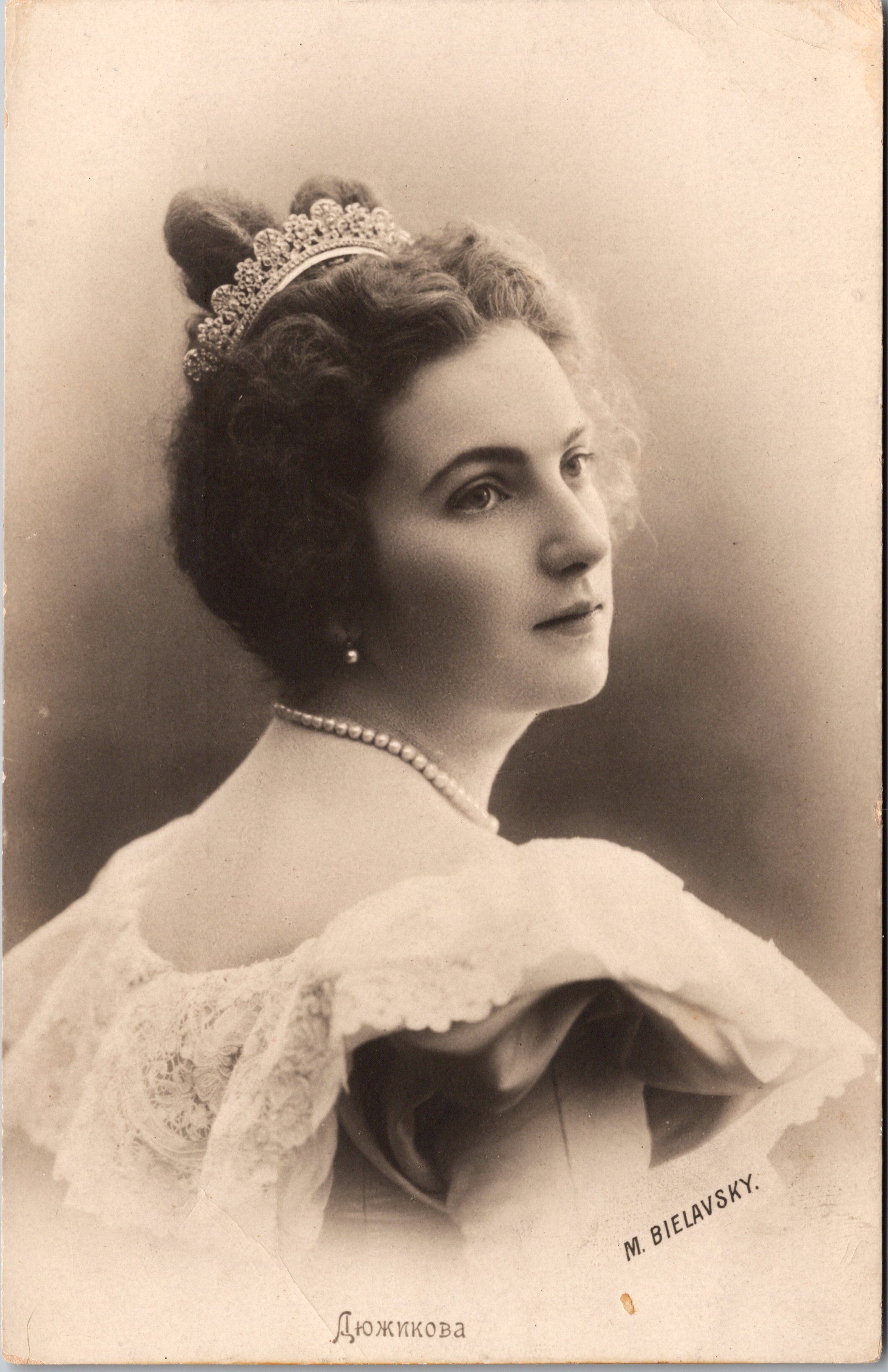 This vintage real photo postcard features a pretty Russian actress. The previous owner of this card identified the actress as Bronislava Rutkovskaya (1880-1969). She appeared in a number of Russian silent films. She also was a dancer. This photo postcard captures Miss Rutkovskaya as she appeared in the play “Jealousy” at the Nezlobins Theater. This postcard was published by Richard (St. Petersburg}. The photographer was M. Bielovsky. This postcard portrait is in good condition (see scans).