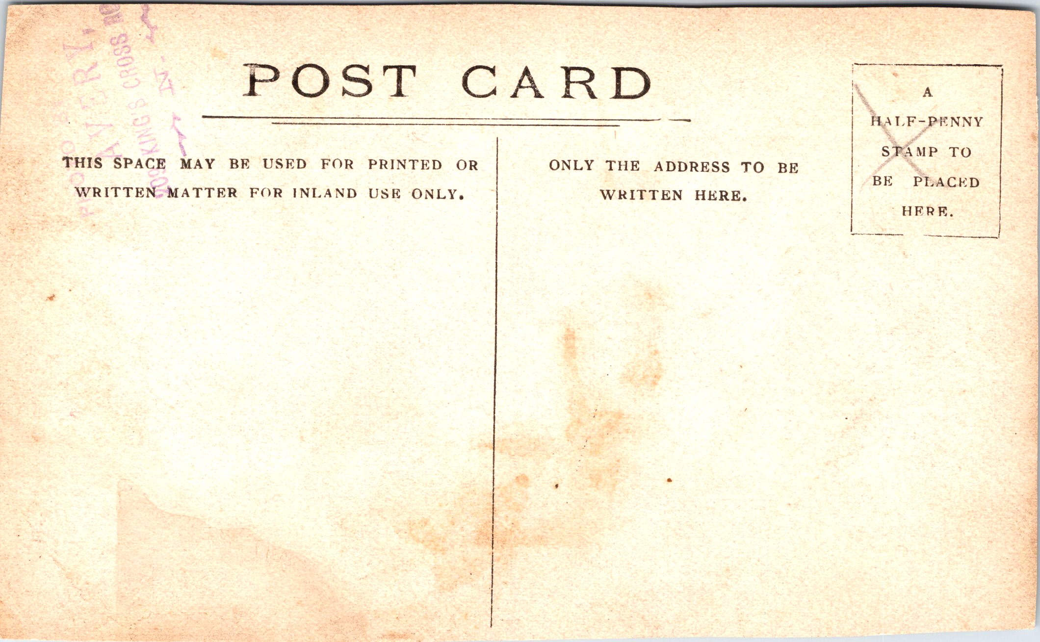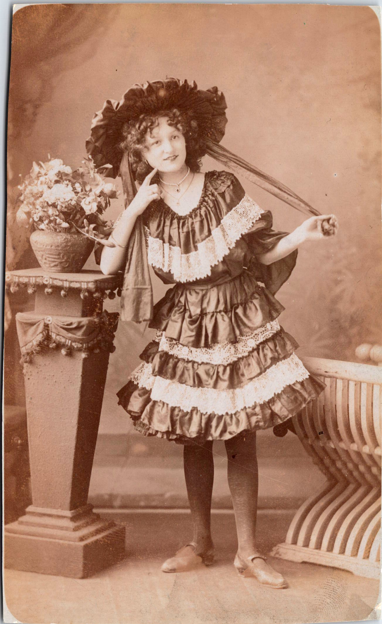 I wish I knew more about this young lady. She has an infectious smile. Her dress is frilly and has rows of lace. Judging by her attire, my guess is that she is a “dancehall girl” or actress. Perhaps a viewer of this vintage old photo postcard has another opinion as to the story behind this image. Some might consider this photo a bit risque. The woman seen in this image is wearing a very short dress for her era. An ink stamp on the reverse of the postcard reveals that this photograph was taken at the Avery studio. We only know that the studio was located on King’s Cross Road. King’s Cross is an area located in Central London. It may follow that Avery’s studio was located in London. SOLD