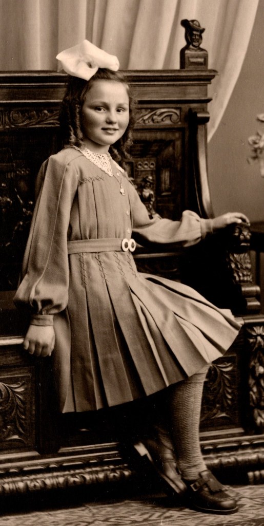 This vintage photo features an adorable straight haired little girl wearing a large bow. The child is well dressed and has a wonderful smile. The photographers name and address is hand stamped on the reverse of this photograph. The photographer, Georges de Coninok operated his studio from Maldegem, Belgium .This vintage photo is in good condition (see scans).