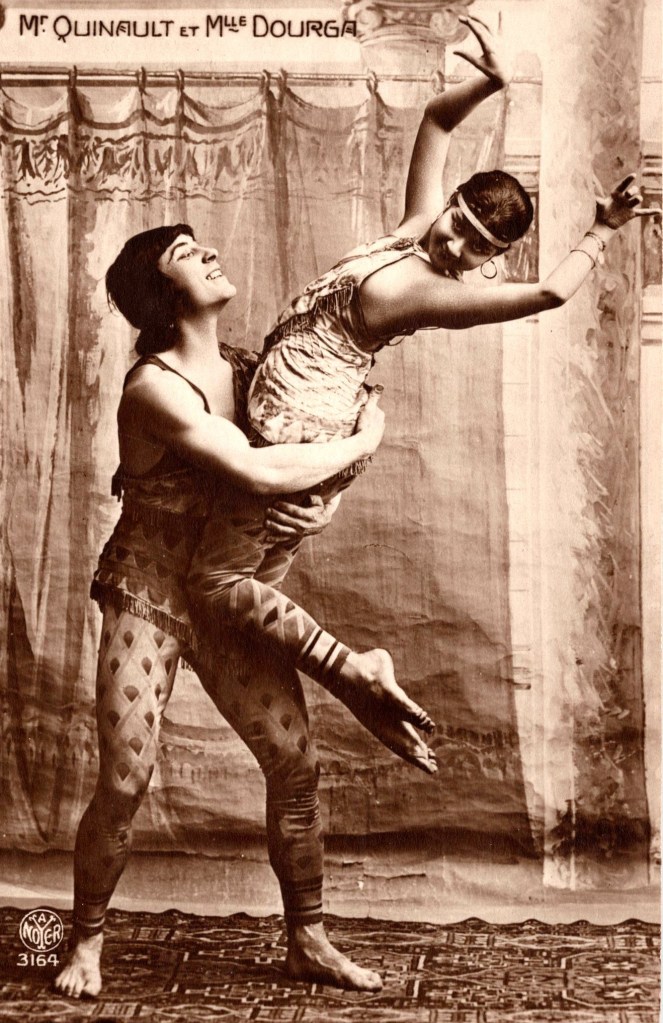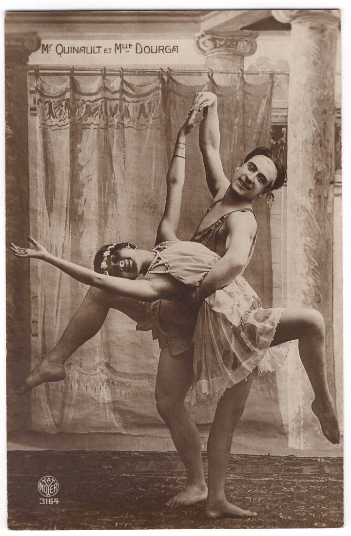 These vintage postcards feature a pair of ballet dancers, Mr Quinault and Mlle Dourga. These action photos capture the two dancers in beautiful ballet poses. (ALL SOLD)