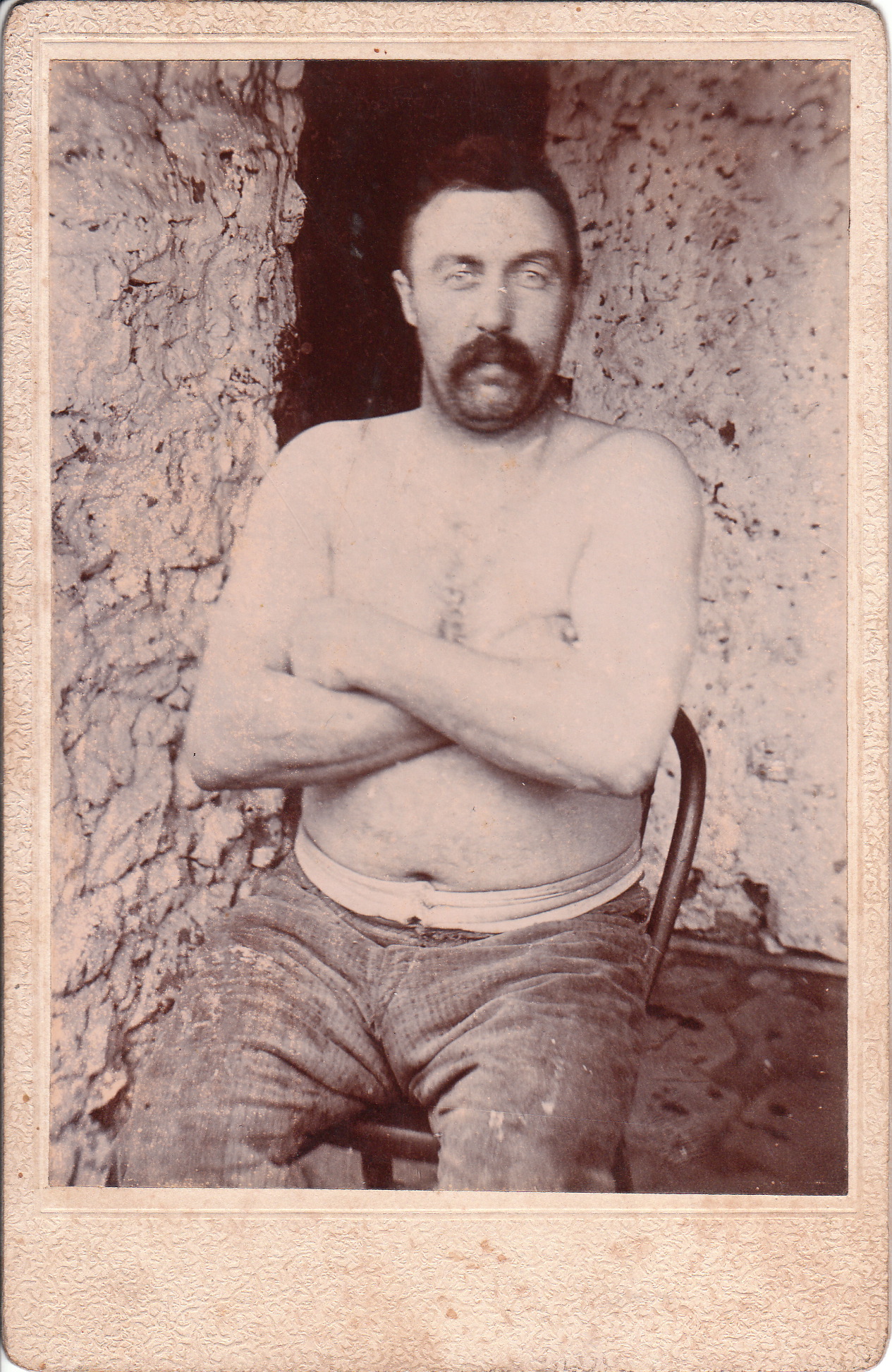 This rare cabinet card captures a bare chested man preparing for a bath. He appears to be muscular and fit. He has a formidable thick mustache. Writing on the reverse of the card states,“This is for mother. Father is taken washing and this is as exactly as he looks”. This cabinet card invites speculation. It appears that the man is separated from his wife. Is he in prison? Is he in the military? The answer is most likely unobtainable as there is no identifying information concerning the identity of the subject, or the photographer. In addition, the location that the photograph was taken is also unknown. A cabinet card photo of a bare chested man is rare unless it is a photograph of a wrestler or boxer. SOLD