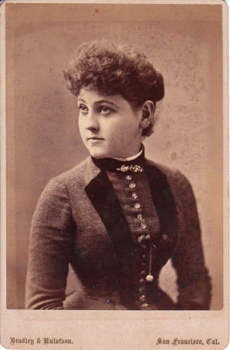 Cabinet Card 2 has an inscription on the reverse signed by “Etta”. Are these two cabinet cards, taken by the same photographer, portraits of the same woman? One can see enough resemblance between the two images to hypothesize  that they are likely the same “Etta”. Take a look at another cabinet card by these photographers by clicking on the category “Photographer: Bradley & Rulofson”. That very same click will provide the reader with additional information about the photographers of this image.  (SOLD)