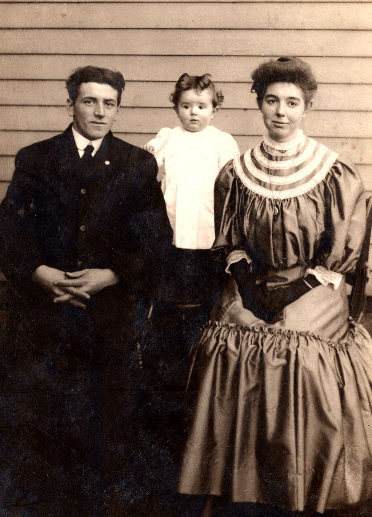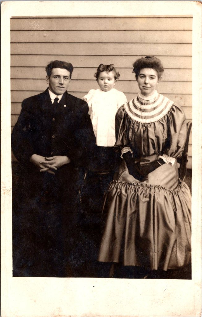 This striking vintage real photo postcard features a family of three posing in front of a house. The parents are dressed in their finest clothes. The mother is wearing dark gloves. The father is wearing an unidentified pin on his lapel. This young couple’s child is adorable. This photograph was either taken at an unidentified studio or is homemade. The card was postmarked in Siddonsburg, Pennsylvania in 1909. SOLD
