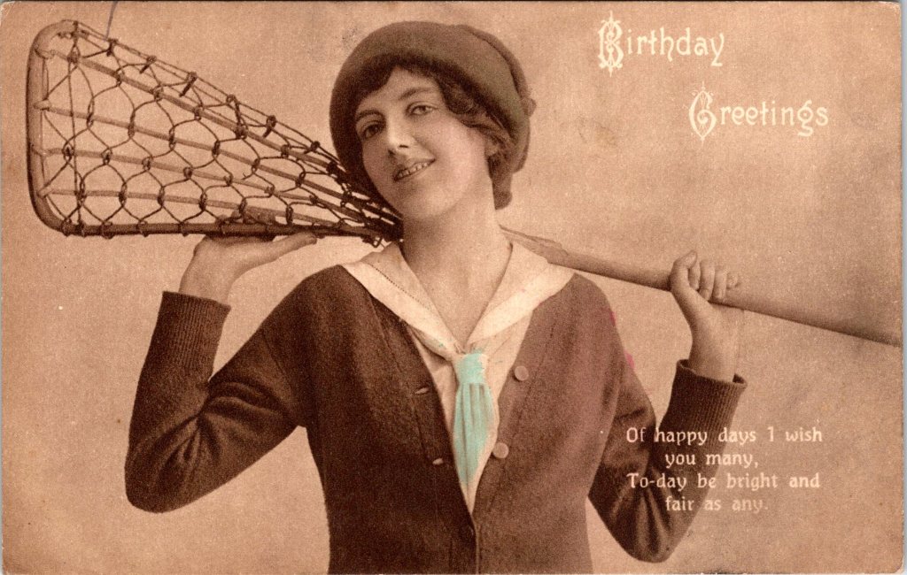 This uncommon vintage real photo postcard features a pretty young woman holding an antique wooden lacrosse stick over her shoulders. She has an engaging smile. This postcard delivered birthday greetings. The message on the reverse of the card also wishes “many happy returns”. The message also indicates that this postcard dates back to 1916. SOLD