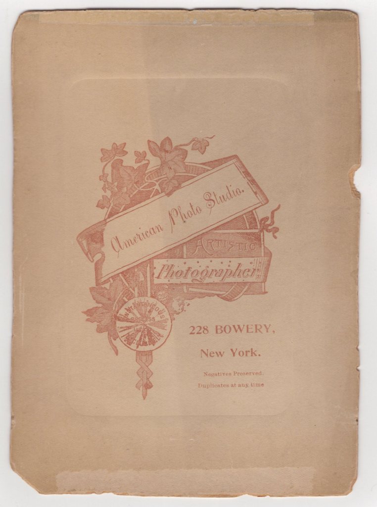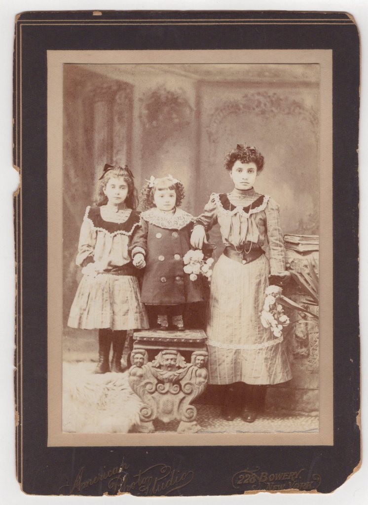 This photograph is a portrait of three young sisters. They are cute and well dressed. The oldest and middle sister are wearing identical, or near identical, dresses. The girls are holding flowers. In the forefront of the image is a strange sculpture. In fact, the faces on the sculpture could be frightening to a young child. The girls are holding flowers. The girl’s portrait was taken by the American Photo Studio. The studio was located at 228 Bowery in New York City.  SOLD